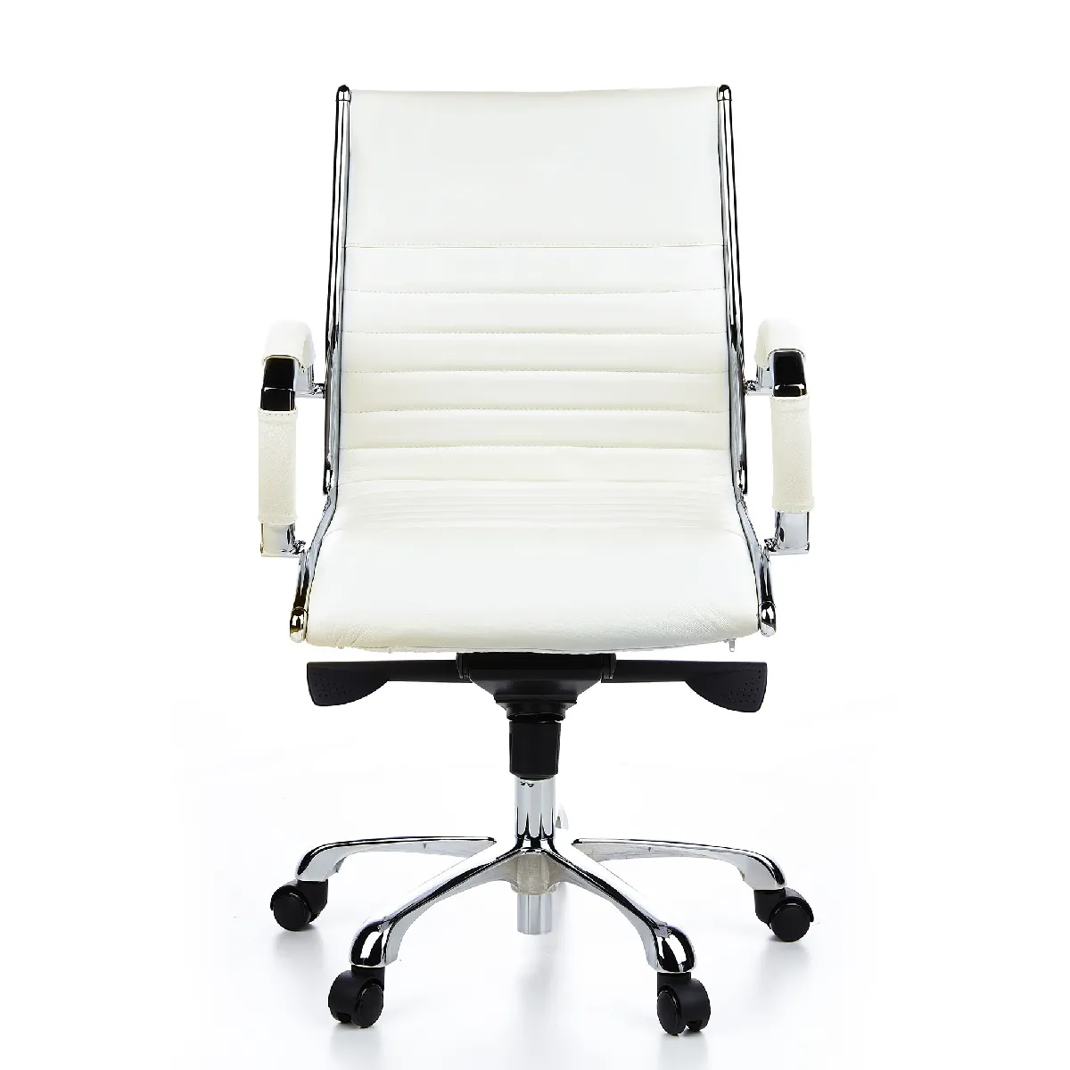 Fauteuil de direction tendance en cuir véritable avec capitonnage horizontal souple. La forme du siège reste simple mais raffinée. L'aluminium chromé lui donne de la légèreté et assure une plus grande stabilité.