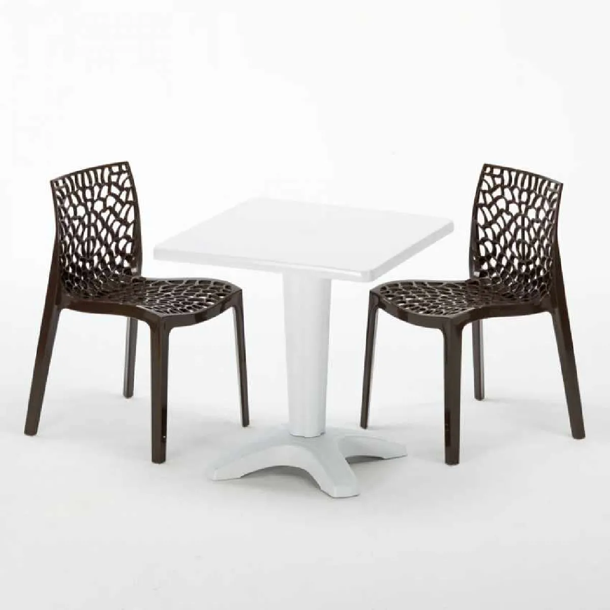 Table et chaises pour bars, cafés et restaurants, version table carrée blanche 70x70cm et chaises Gruvyer de la gamme Grand Soleil.
