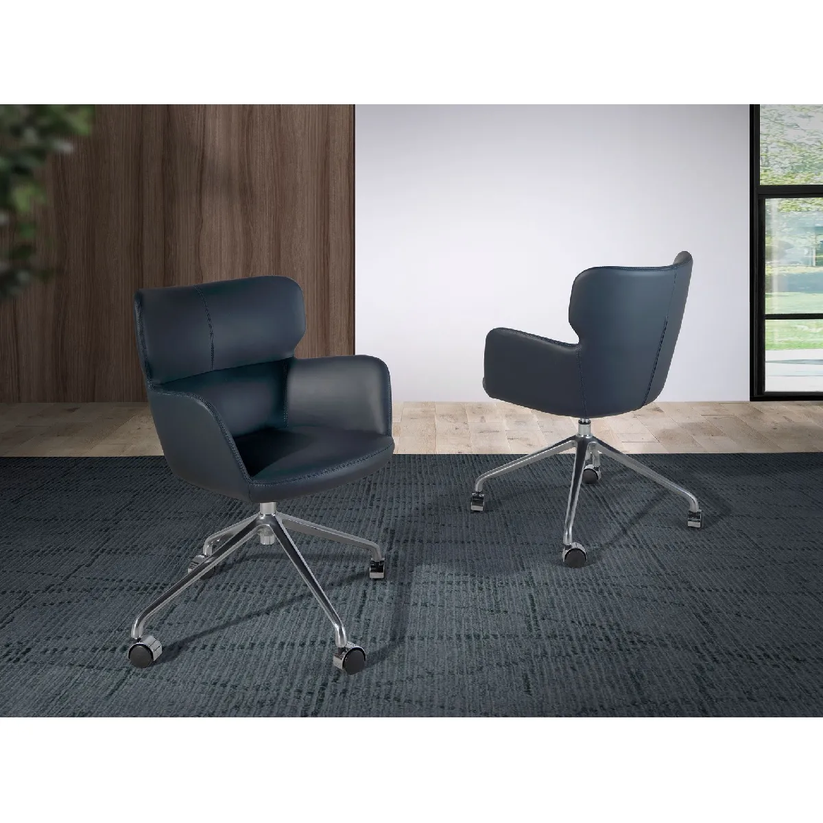 Chaise de bureau pivotante au design moderne, avec assise et dossier en simili cuir bleu. Elle est dotée d'accoudoirs, ce qui la rend plus confortable. Grâce à ses pieds en acier inoxydable chromé, elle deviendra un élément essentiel de votre espace de travail, sans pour autant négliger le style le plus avant-gardiste. Ses roulettes vous apporteront la praticité supplémentaire dont vous avez besoin pour vos heures de travail ou d'étude.