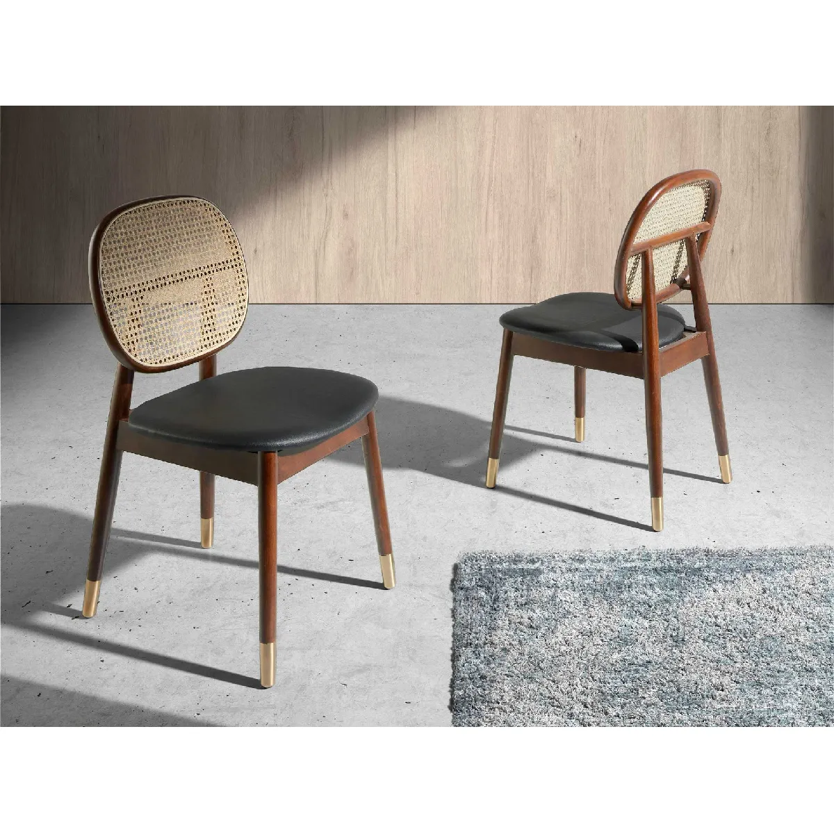 Chaise au design moderne avec assise recouverte de similicuir noir et dossier en rotin. Ses détails en acier inoxydable chromé couleur or et ses pieds en bois couleur noyer, dans un style avant-gardiste mais intemporel, en feront un élément incontournable de votre cuisine ou de votre salle à manger. Cette chaise d'Angel Cerdá allie le style unique et personnel de la marque, ainsi que le plus grand confort et la plus grande stabilité, grâce à la haute qualité de son rembourrage et à la structure originale de ses pieds.