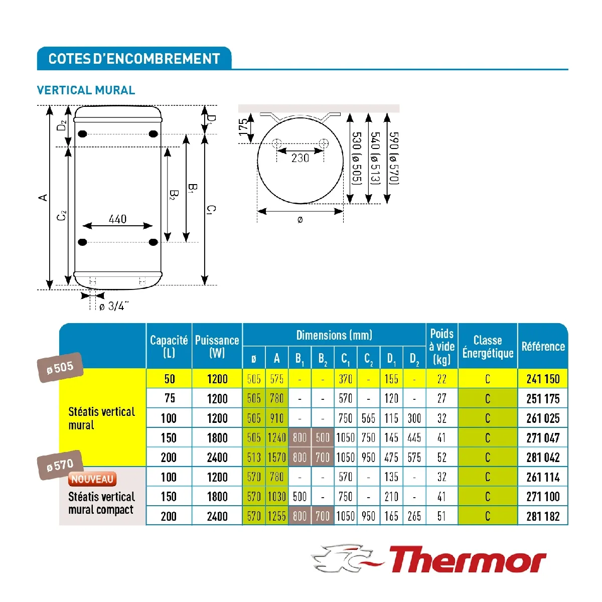 Commentaire vendeur : Chauffe Eau Steatis 50l Vertical Mural Mono Thermor 3546332411505 TRV_1261687 Chauffe-eau vertical mural équipé d'une résistance stéatite plongée dans un fourreau pour limiter l'entartrage, facilement accessible et démontable sans vidange.