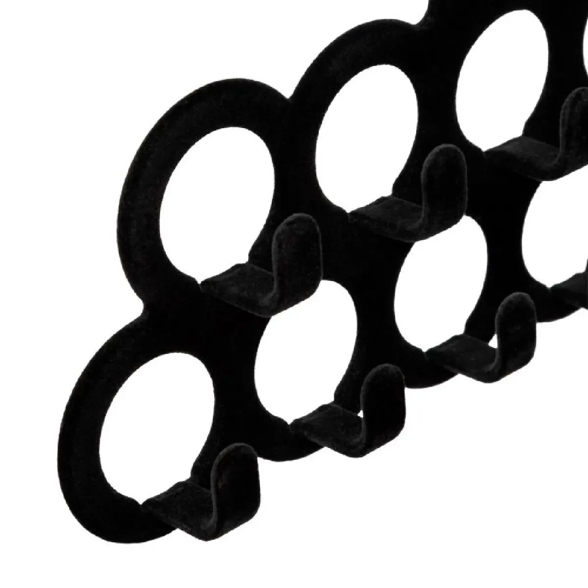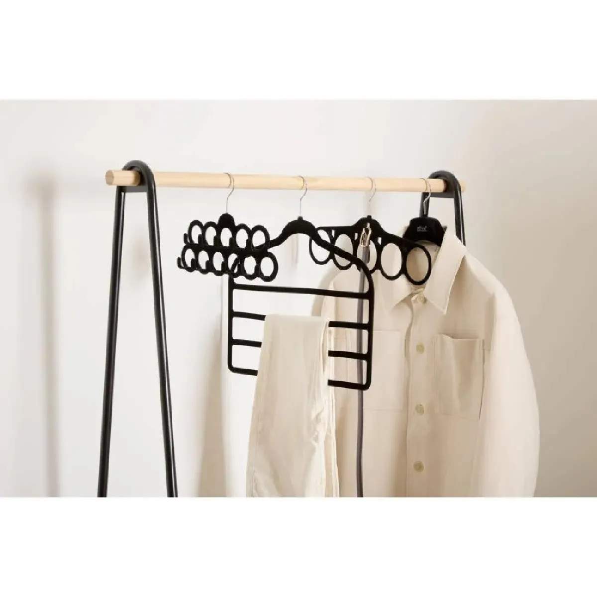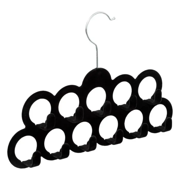 Le format optimisé permet de regrouper ceintures et petits accessoires sur un seul support, tout en préservant la place dans l'armoire. La structure en feutrine noire douce au toucher protège les surfaces des frottements et limite le glissement. Avec 11 anneaux associés à 11 crochets, chaque élément trouve rapidement sa place pour un repérage visuel simple. Les dimensions du cintre, 310 x 220 mm, s'intègrent facilement sur une tringle standard sans encombrer le reste des vêtements.