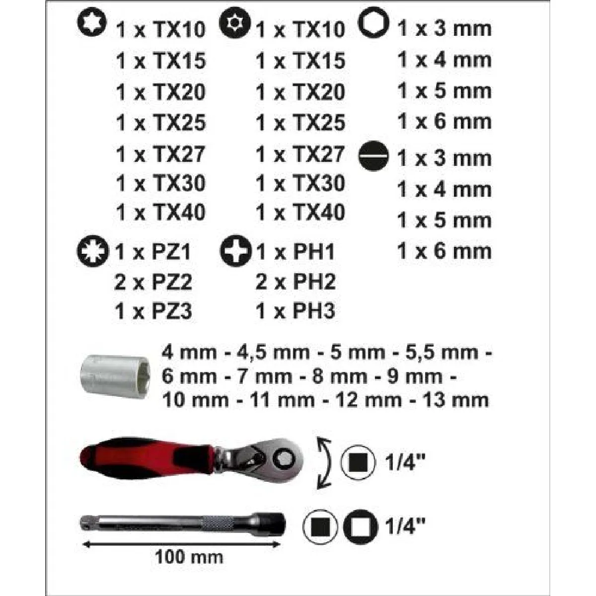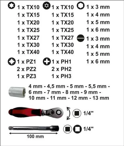 - 46 pièces avec compatibilité 1/4 pour travaux de précision et accès étroits