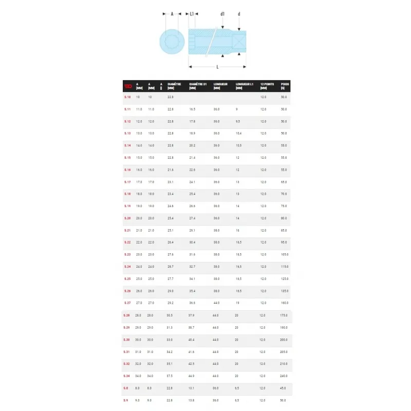 - Type : Douille bi-hexagonale 12 pans, métrique