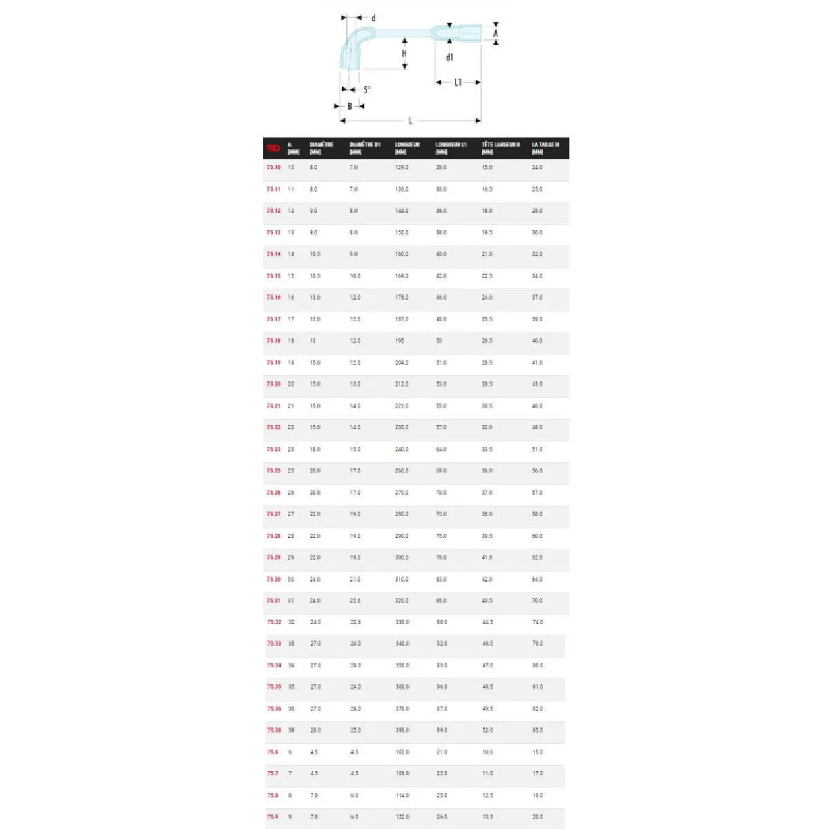 Les dimensions maîtrisées optimisent la maniabilité : longueur totale de 136 mm et hauteur H de 25 mm pour un bon dégagement. Avec un poids de 115 g, l'outil reste stable sans alourdir la prise en main. Le format débouché sur la tête courte améliore la polyvalence sur assemblages avec tiges filetées, tandis que la finition satinée contribue à une durabilité adaptée aux ateliers professionnels. Les cotes détaillées permettent un contrôle précis lors du choix et du positionnement sur la visserie.