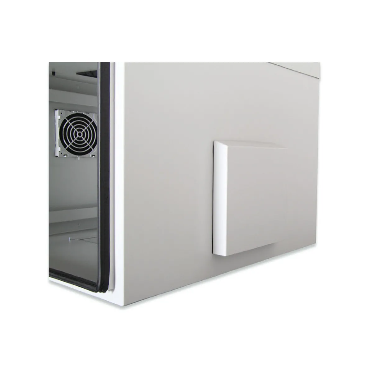 Le châssis est pensé pour les installations nécessitant une protection renforcée contre la poussière et l'humidité, comme les zones industrielles légères ou abritées en extérieur. La conception de coffret modulaire permet d'organiser proprement les éléments actifs et passifs. La face accessible favorise la maintenance, tandis que l'encombrement étudié aide à préserver la circulation dans les couloirs techniques. Ce boîtier répond aux besoins de fixation murale lorsque l'empreinte au sol doit être limitée.