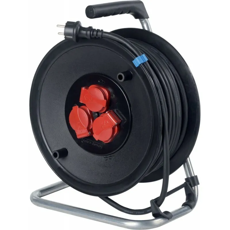 Équipé de 3 prises 230 V / 16 A, cet enrouleur délivre jusqu'à 3500 W pour alimenter plusieurs appareils courants. La protection thermique avec interrupteur et couvercles à charnières contribue à la sécurité d'utilisation en réduisant les risques de surcharge et d'intrusion de particules. La poignée et l'ergonomie du tambour facilitent l'enroulement et le déroulement, tandis que la construction stable et le câble long terme pour extérieur soutiennent une utilisation répétée sur site commercial ou de construction.