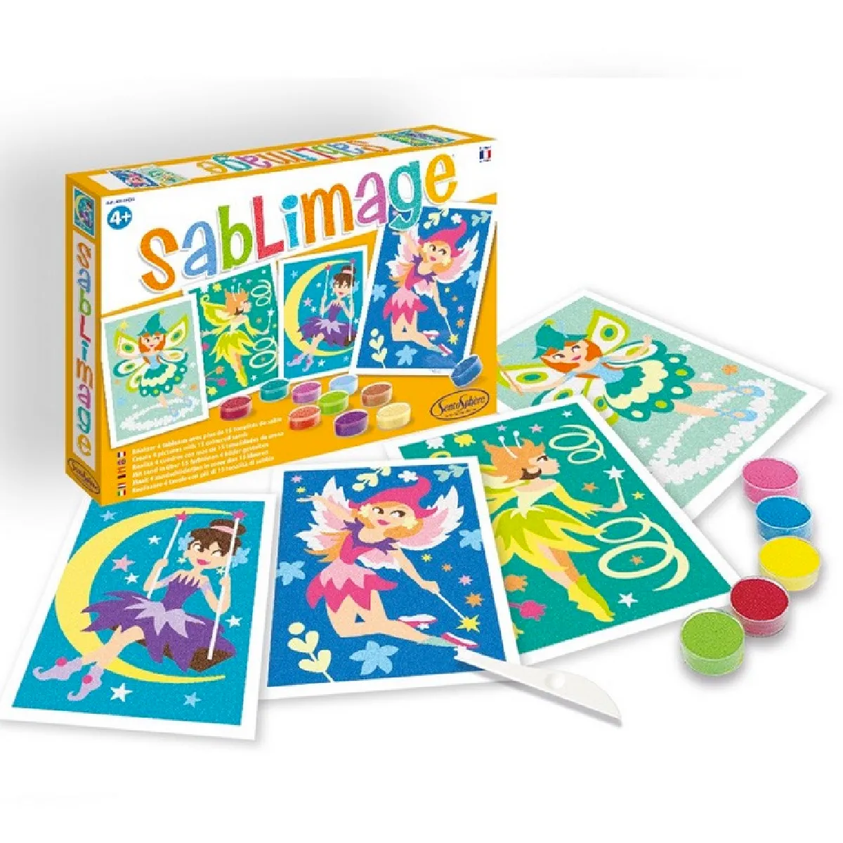 Tel une baguette magique, utilisez du sable coloré pour ajouter, comme par enchantement, une multitude de couleurs et de textures à ces quatre magnifiques fées !