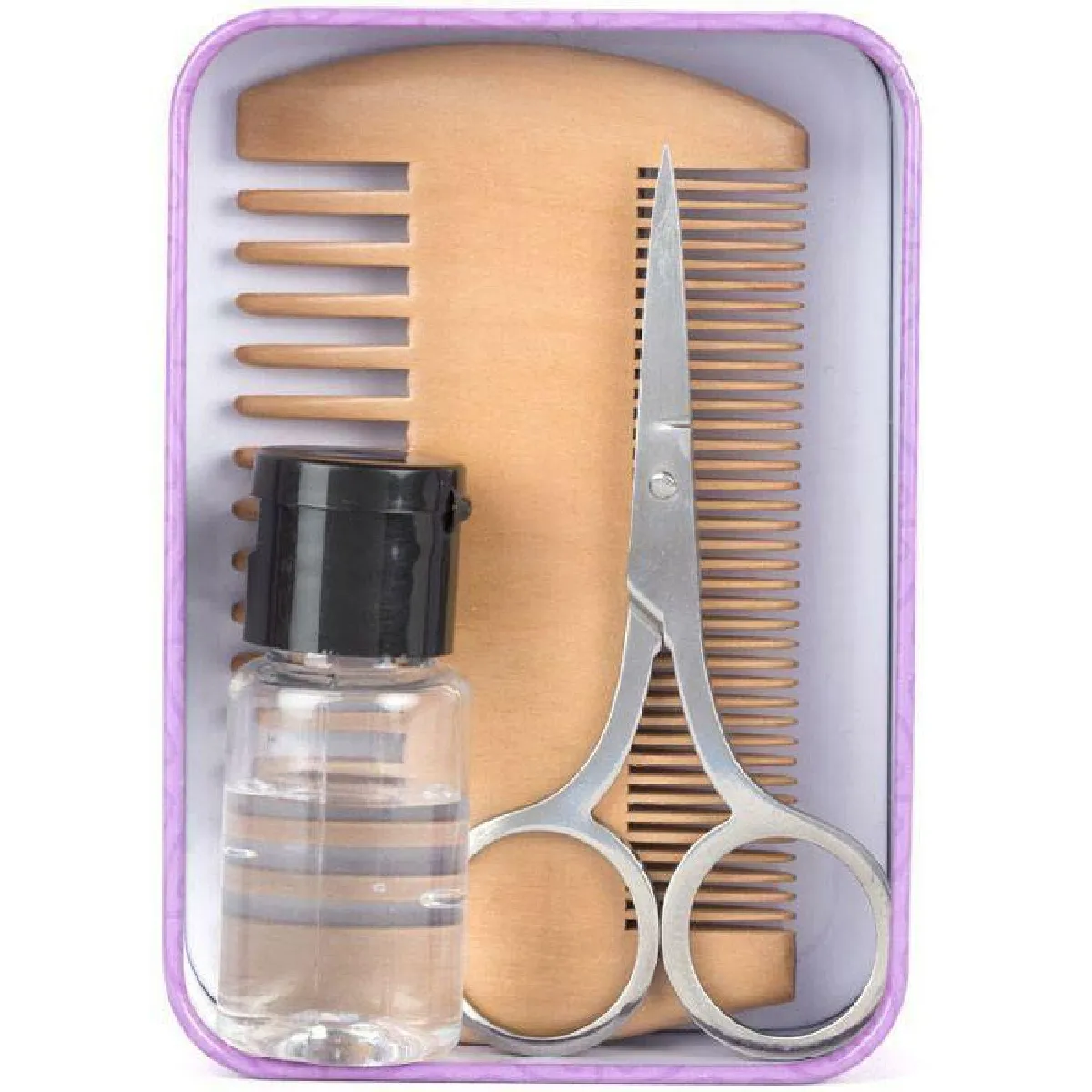 - Kit 3 en 1 : peigne double-face, ciseaux en inox, huile pour barbe