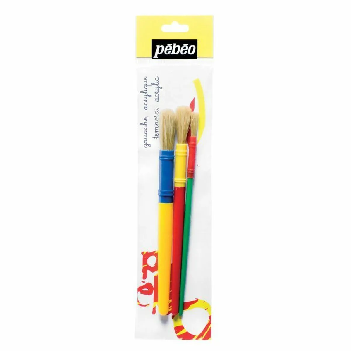 Assortiment de pinceaux en polyamide pour enfants. Idéal pour développer l'esprit créatif des petits artistes. La gamme d'accessoires Pébéo est adaptée pour les petits. Ce kit contient : 3 pinceaux à brosse ronde et poils durs. A utiliser avec de la gouache, pour effectuer des traits plus ou moins épais. Âge à partir de : 3 ans
