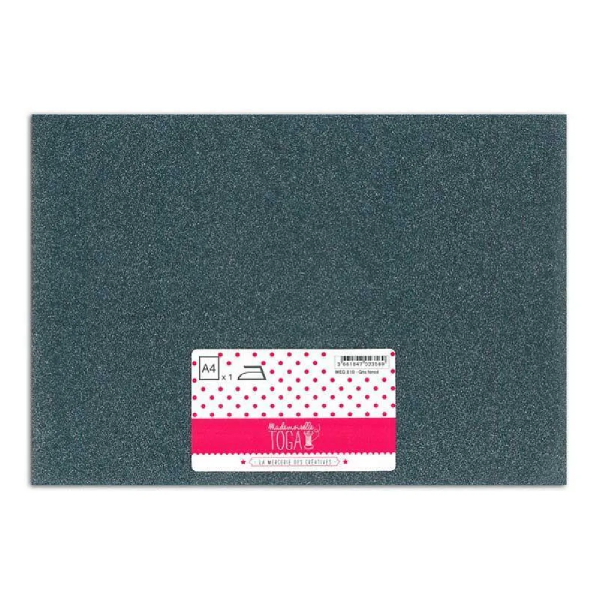 - Matière : tissu thermocollant pailleté, couleur gris foncé