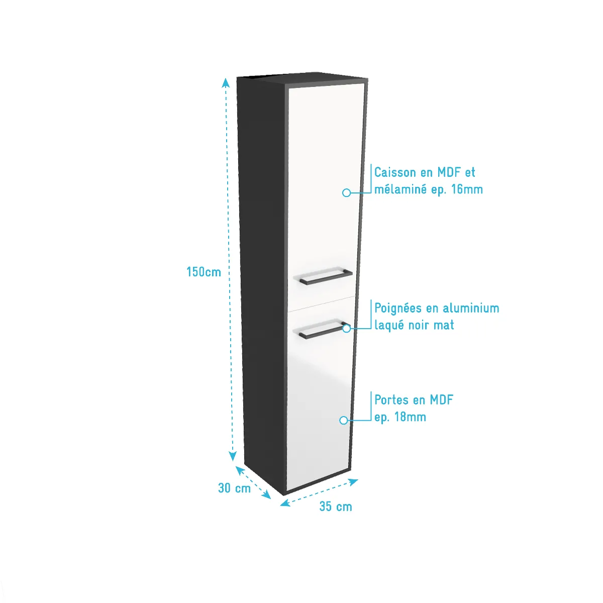 Meuble colonne salle de bain - Colonne suspendue - 2 portes MDF blanc - Poignées aluminium - 30 x 35 x 150 cm