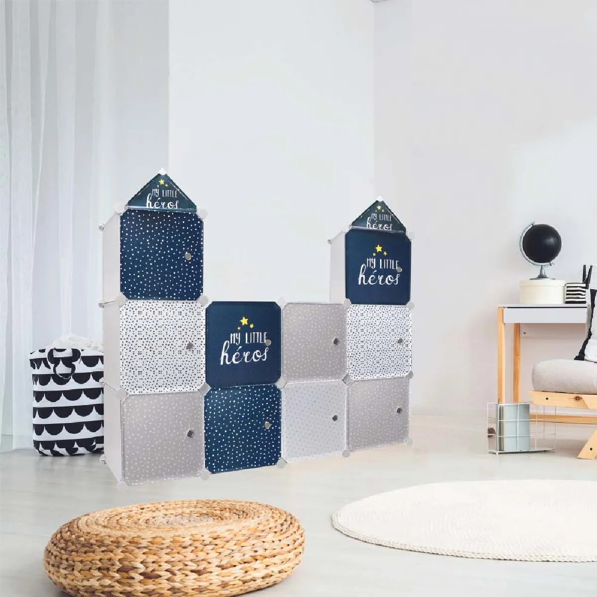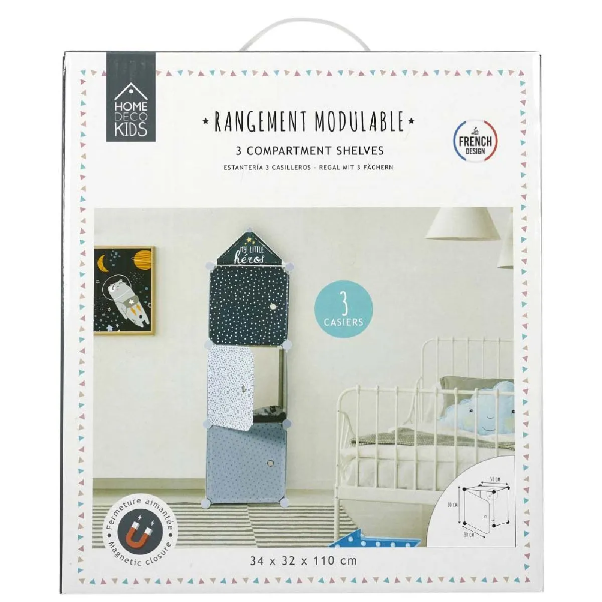 - 3 cubes de 30 x 30 cm modulables pour adapter le rangement aux objets de l'enfant