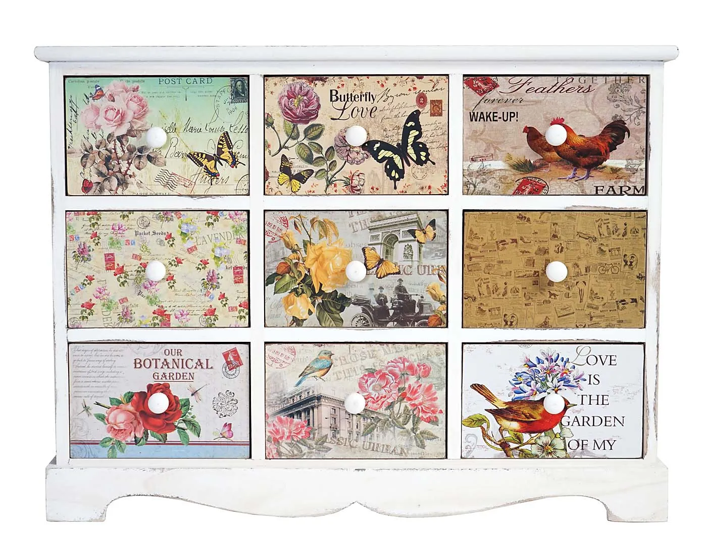 Les 9 tiroirs, chacun doté d'un pommeau en bois, offrent des rangements individuels pour classer soigneusement petits textiles, papeterie et accessoires. Les dimensions intérieures d'un tiroir d'environ 13,5 x 21,5 x 24,0 cm permettent de séparer les effets du quotidien sans les entasser. La façade multicolore, associée à une laque blanche mate et un effet vieilli maîtrisé, crée un point visuel discret qui s'accorde aux ambiances campagne et shabby chic.