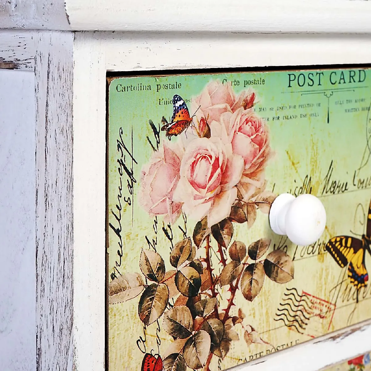 Avec ses 9 tiroirs et son format compact 60 x 79 x 30 cm adapté aux petits espaces, cette commode organise efficacement les objets du quotidien. Le corpus en bois massif de paulownia, léger et stable, facilite le déplacement à la maison. La finition laquée blanc mat avec techniques d'essuyage antique crée un rendu vieilli harmonieux, tandis que la décoration façon cartes postales anciennes avec fleurs apporte une note vintage. Livrée entièrement montée pour une mise en service immédiate, elle s'intègre dans une entrée, une chambre ou un salon pour trier accessoires, courrier et textiles légers.