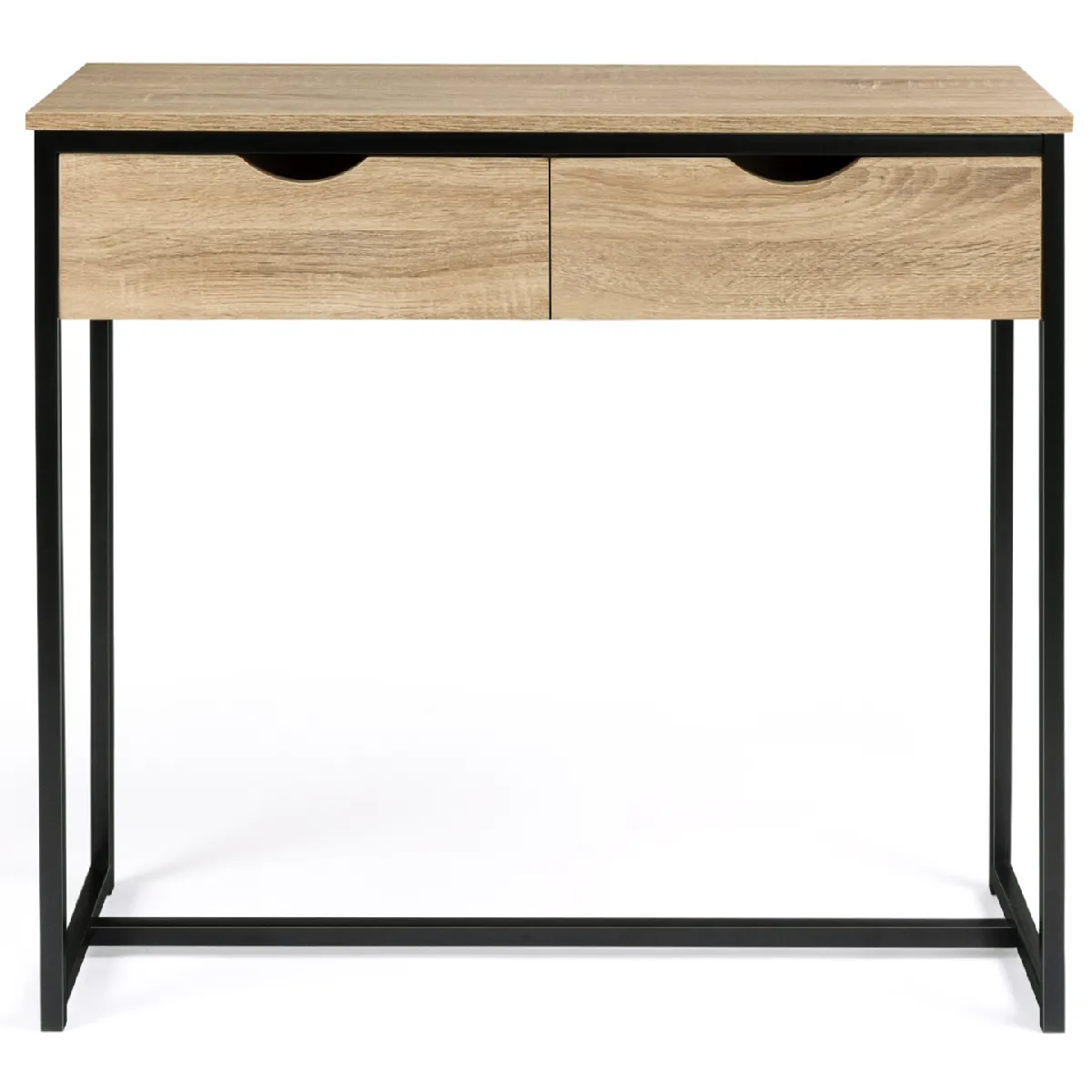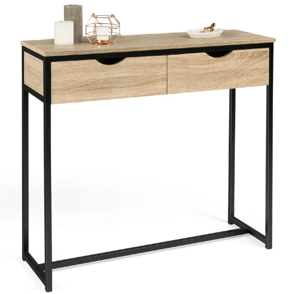Descriptif de la console 2 tiroirs DETROIT design industrielLe style industriel et les lignes sobres bi-matière de la console 2 tiroirs DETROIT offriront à votre entrée, chambre, bureau ou salon un esprit "factory" ! De quoi réaliser une ambiance ultra chaleureuse et tendance !Esthétique, cette jolie console 2 tiroirs DETROIT au design industriel trouvera idéalement sa place dans les intérieurs urbains et contemporains, mais aussi plus rustiques.Ses 2 tiroirs vous offrent un espace de rangement fermé idéal pour vos effets personnels, qui sont gardés à l'abri des regards et de la poussière !Profitez du plateau supérieur pour vos objets déco : plantes vertes, vide-poches, vases, bougies, etc. Peu profonde, elle sera également parfaite utilisée comme meuble TV dans la chambre, pour créer un espace détente propice à l'endormissement ! Stable et robuste grâce à ses tiroirs et son plateau en particules de bois épaisseur et sa structure en métal noir, vous pourrez déposer tablette, lampe d'appoint, en toute sérénité.Son design sobre et ses couleurs naturelles lui donnent une allure élégante authentique et lui permettront de s'intégrer dans n'importe quelle pièce sans la surcharger.Sublimez dès maintenant votre intérieur avec la console 2 tiroirs DETROIT design industriel !Dimensions de la console 2 tiroirs DETROIT design industriel Dimensions globales : Longueur 90 cm x largeur 30 cm x Hauteur 80 cmDimensions des tiroirs : Longueur 42 cm x largeur 24 cm x Hauteur 14 cmPanneaux de particules de boisTubes en métalDécouvrez toute notre collection industrielle sur notre boutique en ligne !