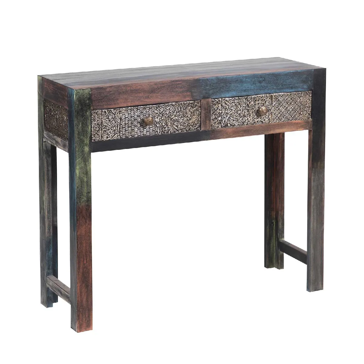 Elle recèle biens des trésors... Unique, cette console prend vie dans un bois exotique, produit et façonné en Inde par des artisans ébénistes, soucieux de transmettre leur savoir-faire et leur culture. Un art qui s'exprime aussi dans les motifs ciselés sur les feuilles de métal qui habillent les deux tiroirs de la console. Meuble d'inspiration ethnique par excellence, le manguier massif s'anime dans différentes couleurs afin de personnaliser et égayer l'ensemble. Vous l'aurez compris, Bois et Chiffons déniche des meubles d'excellence pour des intérieurs qui font la différence. Donnez le ton à votre décoration d'intérieur en l'installant dans votre entrée.
