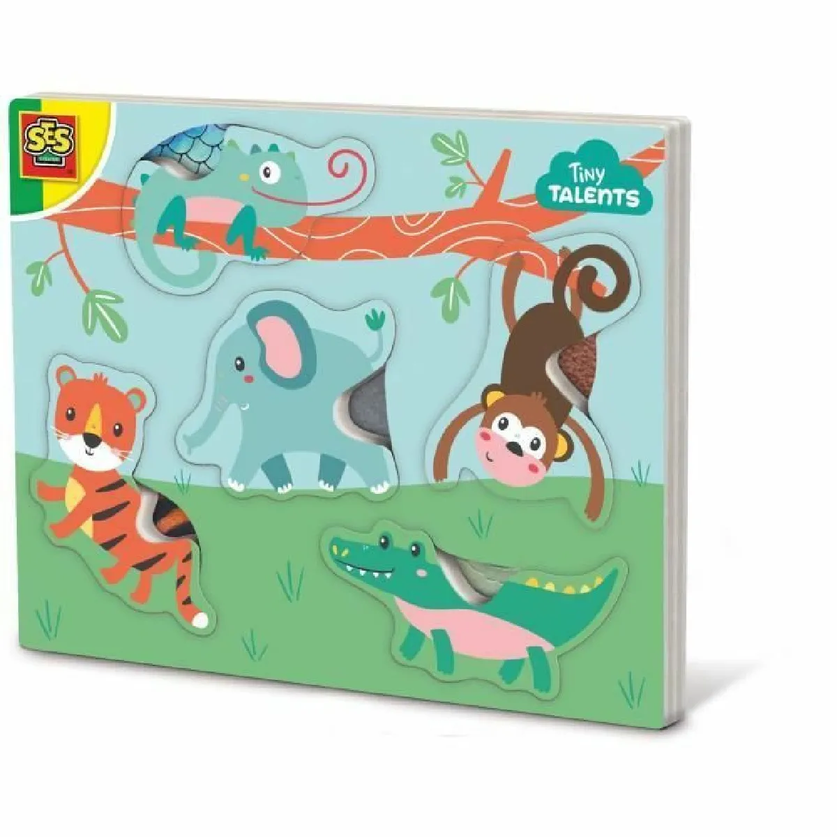 Chaque pièce épaisse tient bien en main pour favoriser la préhension des tout-petits et la coordination il-main. Le plateau intègre des encoches qui aident l'enfant à retirer les éléments sans effort, afin d'encourager l'autonomie pendant le jeu. Sous chaque forme d'animal, une surface à toucher reproduit une texture de fourrure qui stimule l'exploration tactile et enrichit le vocabulaire sensoriel. Le matériau en bois solide assure une bonne stabilité sur la table et supporte les manipulations répétées.