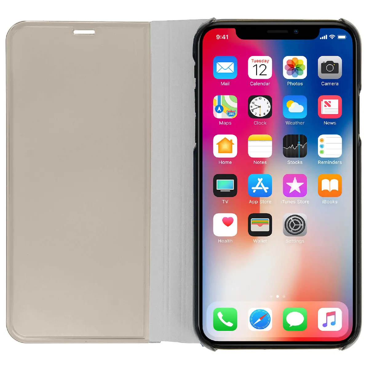 Etui à clapet effet miroir pour iPhone X / XS. Protection integrale concue en polycarbonate. clapet translucide laisse apparaitre vos informations lorsque l'ecran est allume. Fonction support horizontal integree. Fonctions accessibles. Coque rigide.