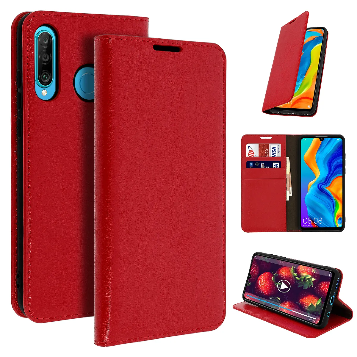 Housse en cuir véritable pour Huawei P30 Lite. Protection intégrale contre les chocs et les rayures. Le clapet dispose de 3 compartiments pour cartes + Pochette latérale pour billets. Fonctions accessibles. Fonction support vidéo.