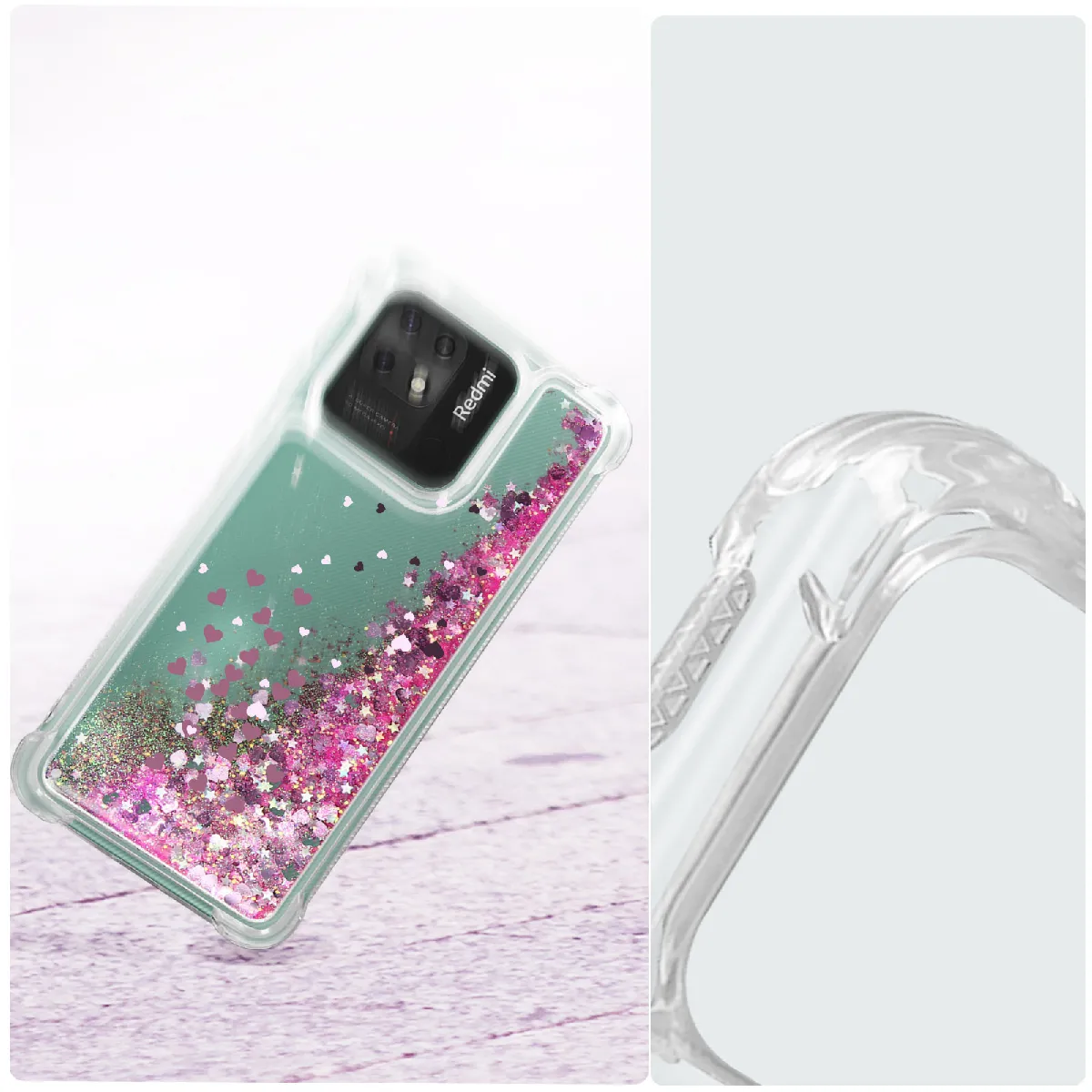 Coque de protection pour Xiaomi Redmi 10C. Conçue en silicone souple avec coins renforcés. Bordures caméra et écran surélevées. Paillettes scintillantes liquides en forme de cur intégrées dans la coque. Fonctionnalités accessibles. Boutons redessinés.POINTS FORTS: