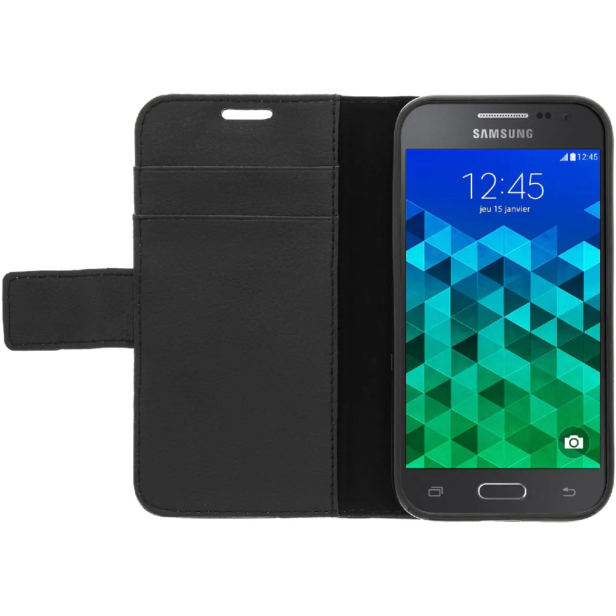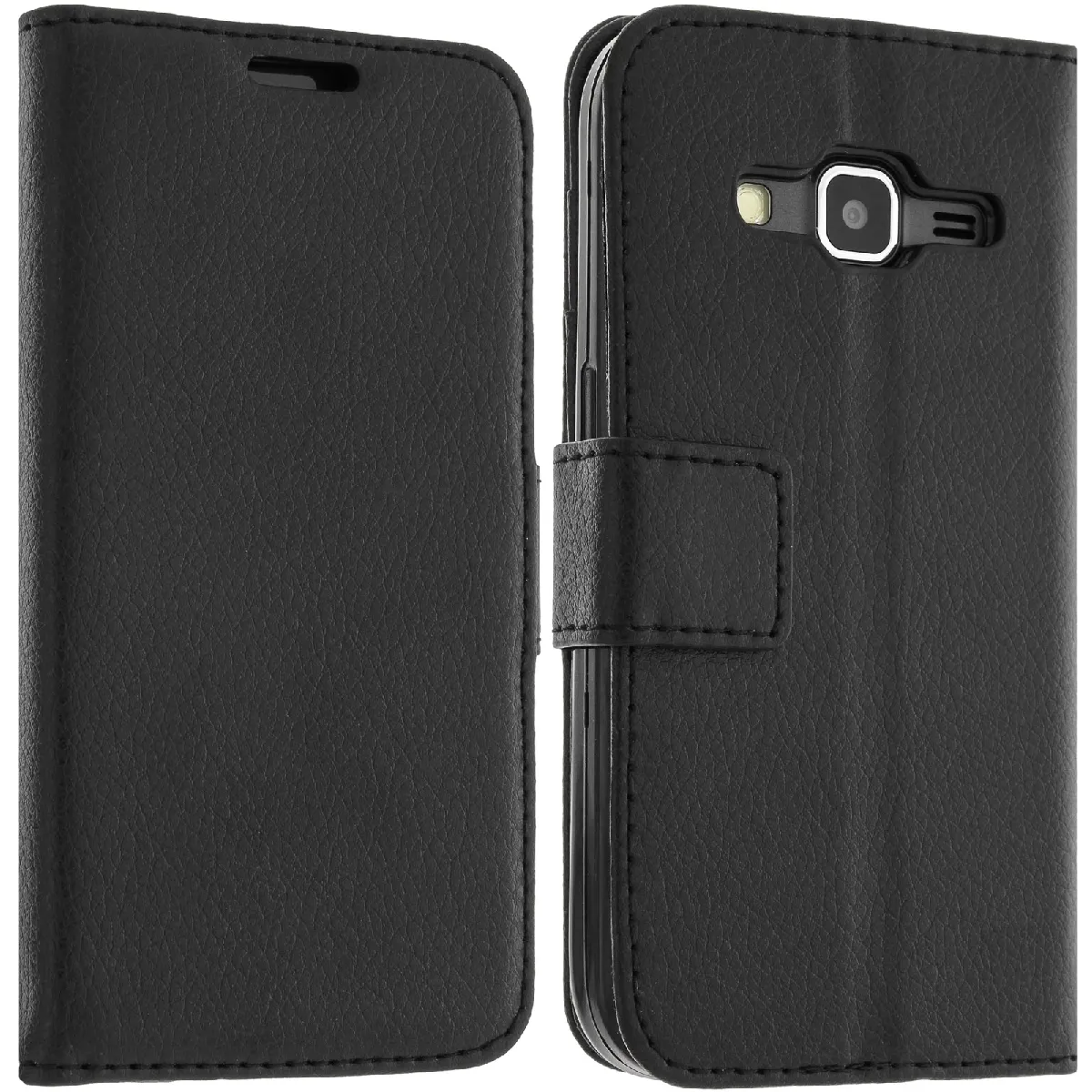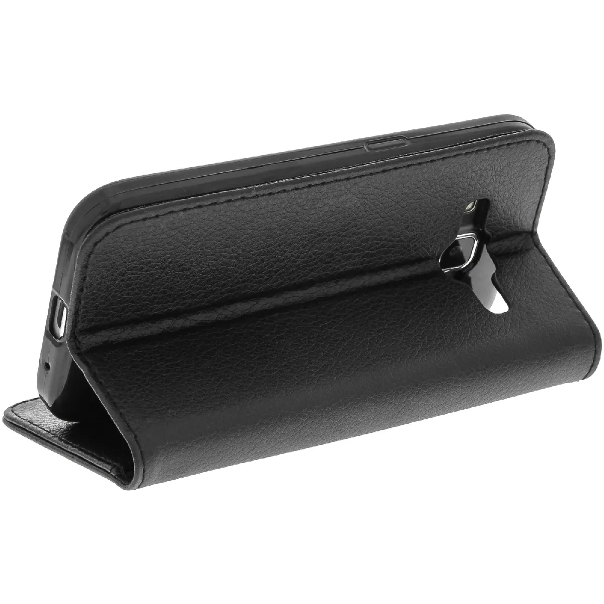 Housse a clapet portefeuille, fonction support pour Samsung Galaxy Core Prime et Core 2. Concu en simili-cuir graine, cet etui assure une protection integrale contre les chocs et les rayures du quotidien. Il se demarque par son elegance et ses fonctions.