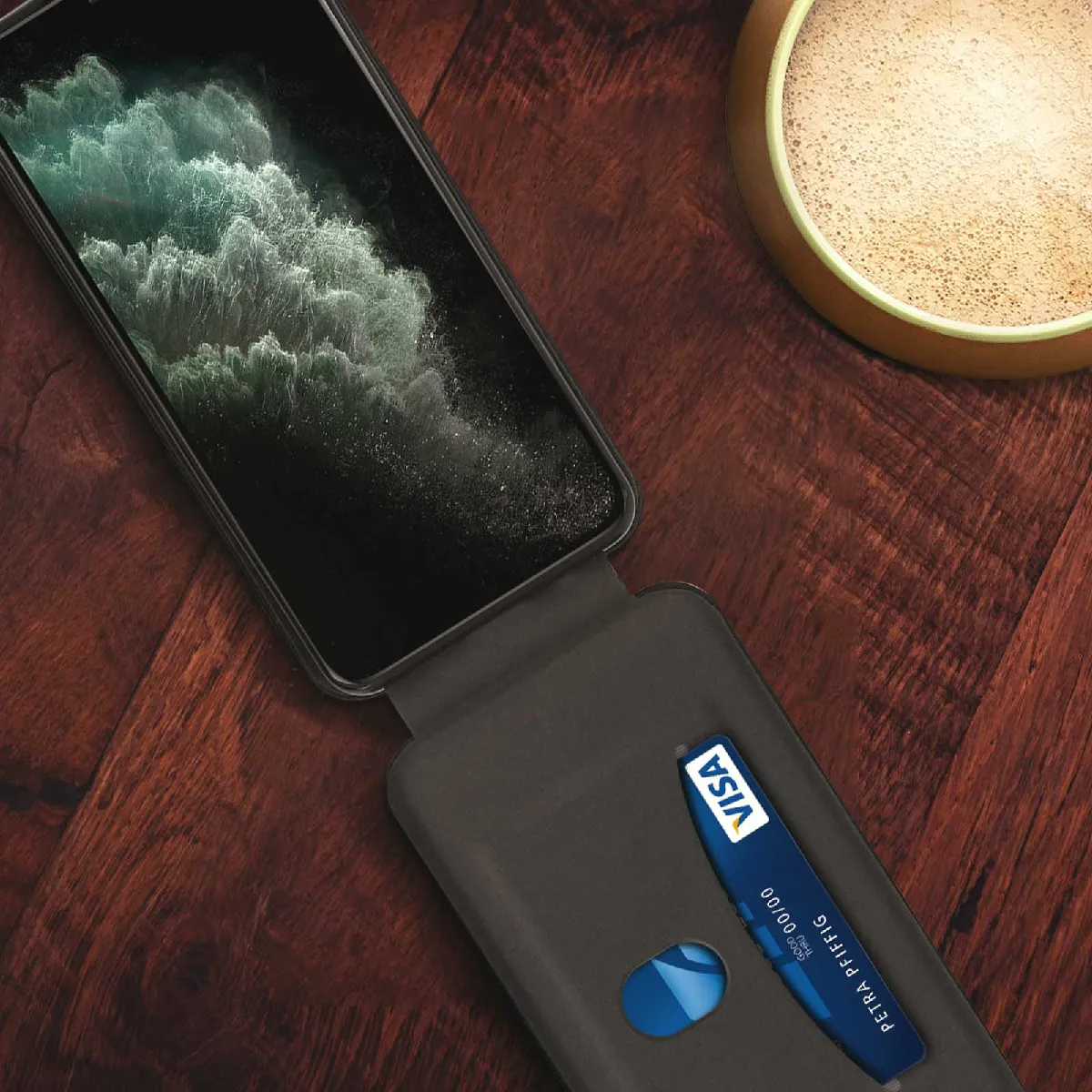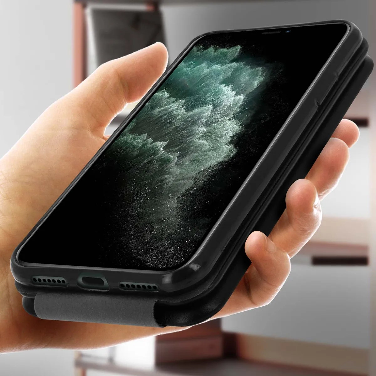 Housse à clapet vertical pour Apple iPhone 11 Pro. Étui de protection intégrale. Revêtement en éco- cuir effet texturé. Design élégant et sobre. Espace de rangement pour carte. Fermeture magnétique discrète. Fonctionnalités accessibles.