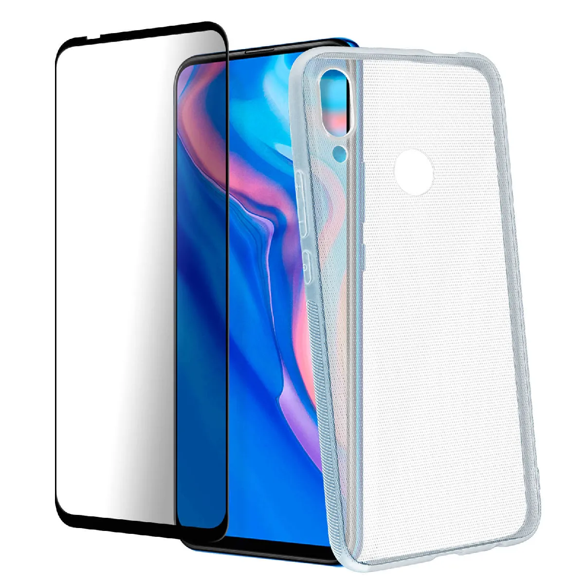 Pack protection Huawei P Smart Z / Y9 Prime 2019 / Honor 9X. Coque transparente en silicone gel qui protège des chocs et rayures. Film protège écran en verre trempé ultra-résistant aux contours colorés. Fonctions accessibles.