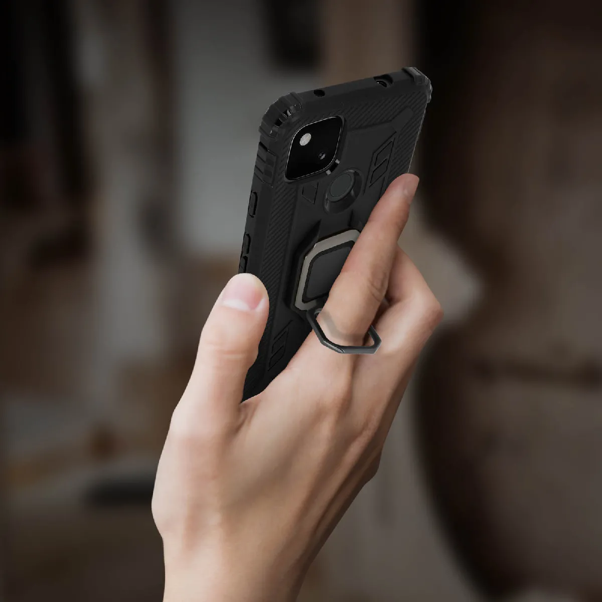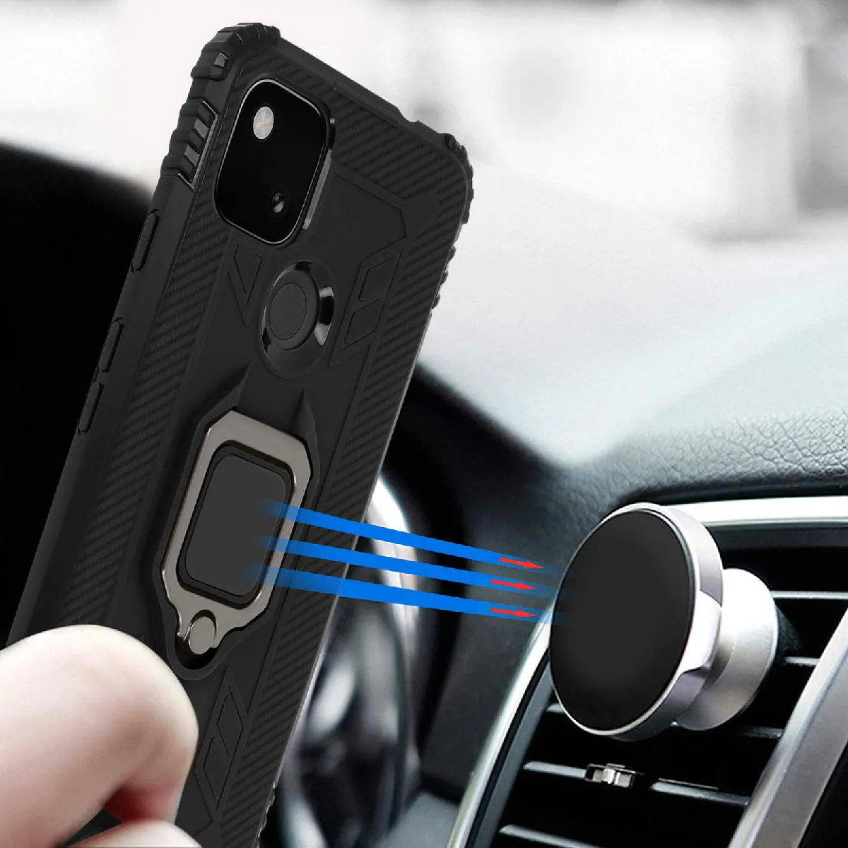 Coque antichoc pour Google Pixel 4A. Ultra-résistante conçue avec du silicone flexible. Bague de maintien pouvant se transformer en support vidéo. Système métallique compatible avec un support magnétique. Fonctionnalités accessibles.