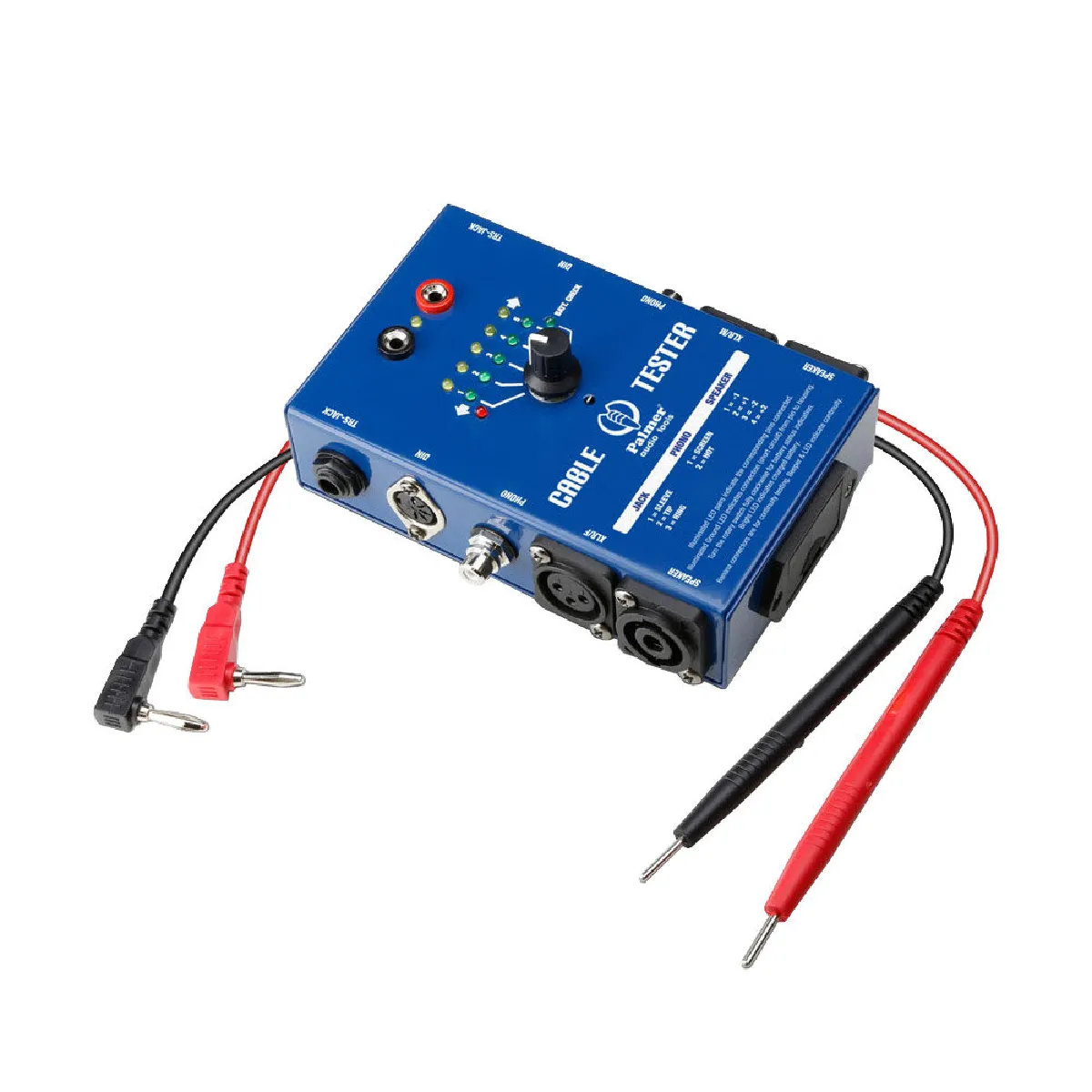 Testeur de câbles audio — boîtier métallique — alimentation 9 V — connecteurs XLR, jack/TRS, RCA, Speakon, MIDI/DIN