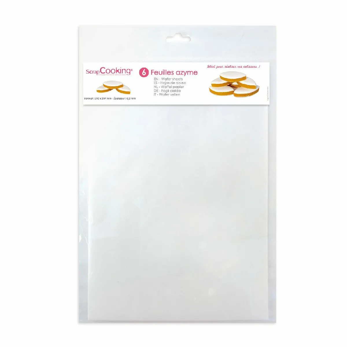 Feuilles de papier azyme pour calissons et nougats 6 feuilles azymes, indispensables à la réalisation des calissons et nougats, mais aussi pour la décoration de gâteaux ou bûches de Noël! C'est avec ces feuilles, aussi appelées papier hostie, que vous pouvez découper et constituer les décors azyme à disposer sur une pâtisserie, notamment la bûche de Noël. Ces feuilles sont fabriquées comme du pain aux céréales, mais non levé (pas gonflé par l'effet de la levure). Découpez vos feuilles azymes aux dimensions souhaitées à l'aide d'une paire de ciseaux alimentaires. Traditionnellement, le pain azyme est utilisé pour la Pessa'h juive ou l'Eucharistie catholique. Ingrédients : fécule de pomme de terre, eau. Peut contenir des traces de céréales, lais, soja et dérivés. A conserver à l'abri de la lumière et de l'humidité après ouverture. Format : 210 x 297 mm, épaisseur : 0.3 mm. Peut également être utilisé pour décorer les gâteaux à l'aide des FEUTRES ALIMENTAIRES SCRAPCOOKING®.