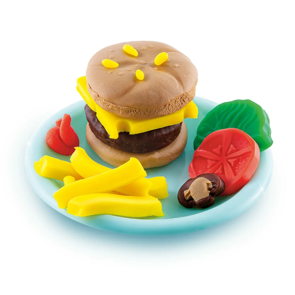 Antibacterial dough - Un kit de pâte à modeler antibactérienne avec de nombreux moules et outils pour réaliser des burgers en pâte à modeler. Une formule brevetée qui élimine 99,9% des bactéries sur les mains.