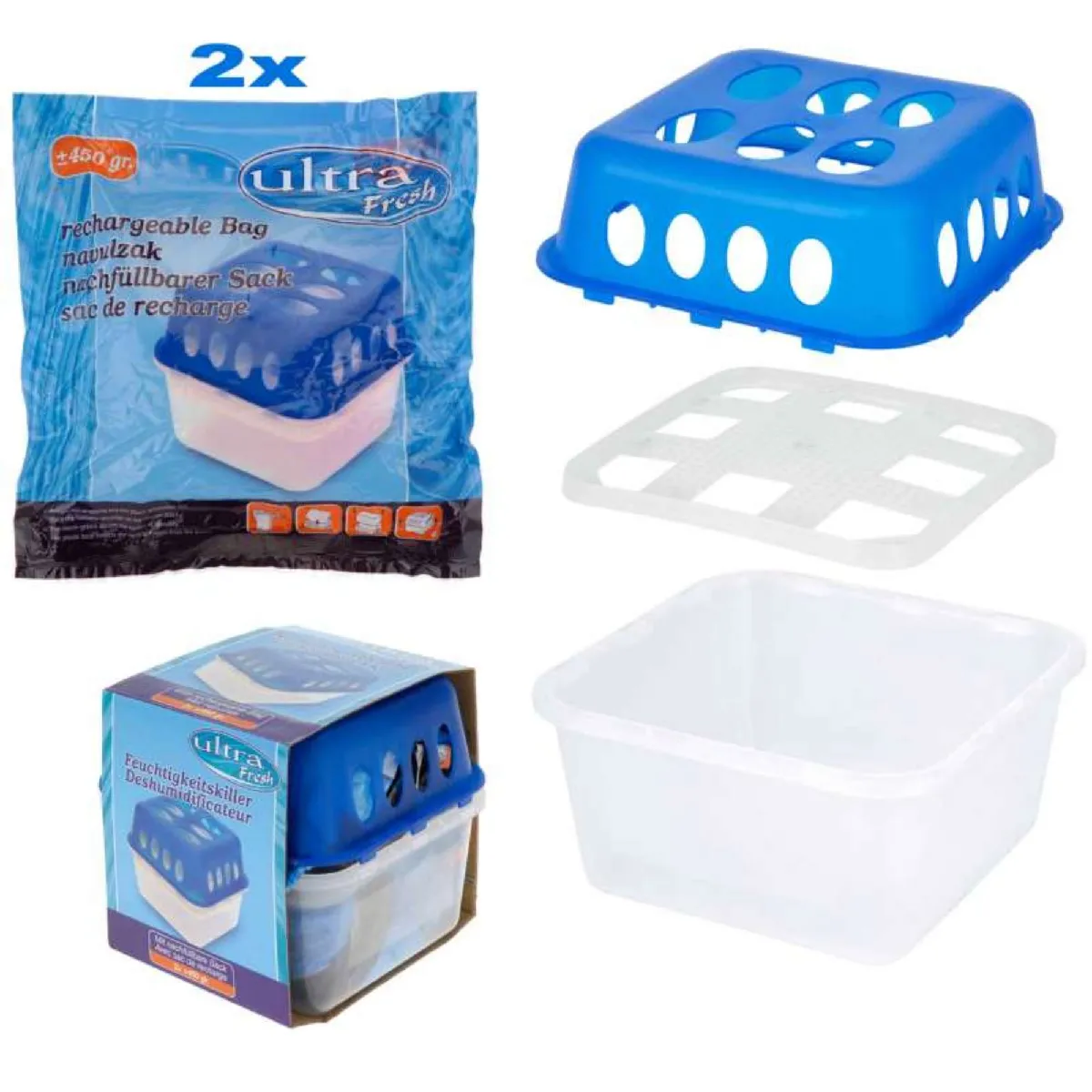 Livré avec 2 recharges 400 g - Évite moisissures - Dimensions: 130 x 130 x 120 mm