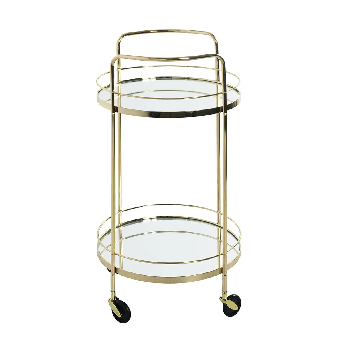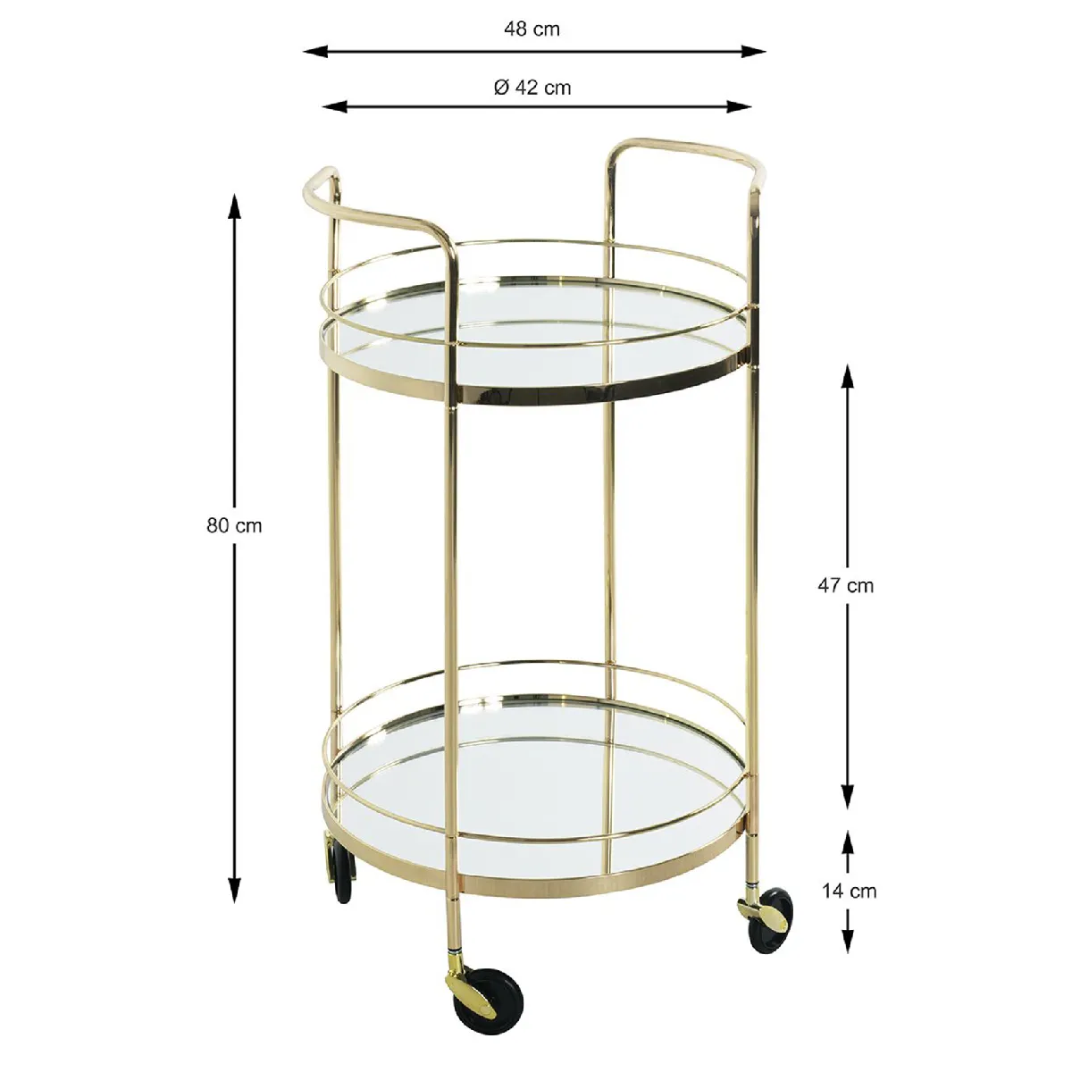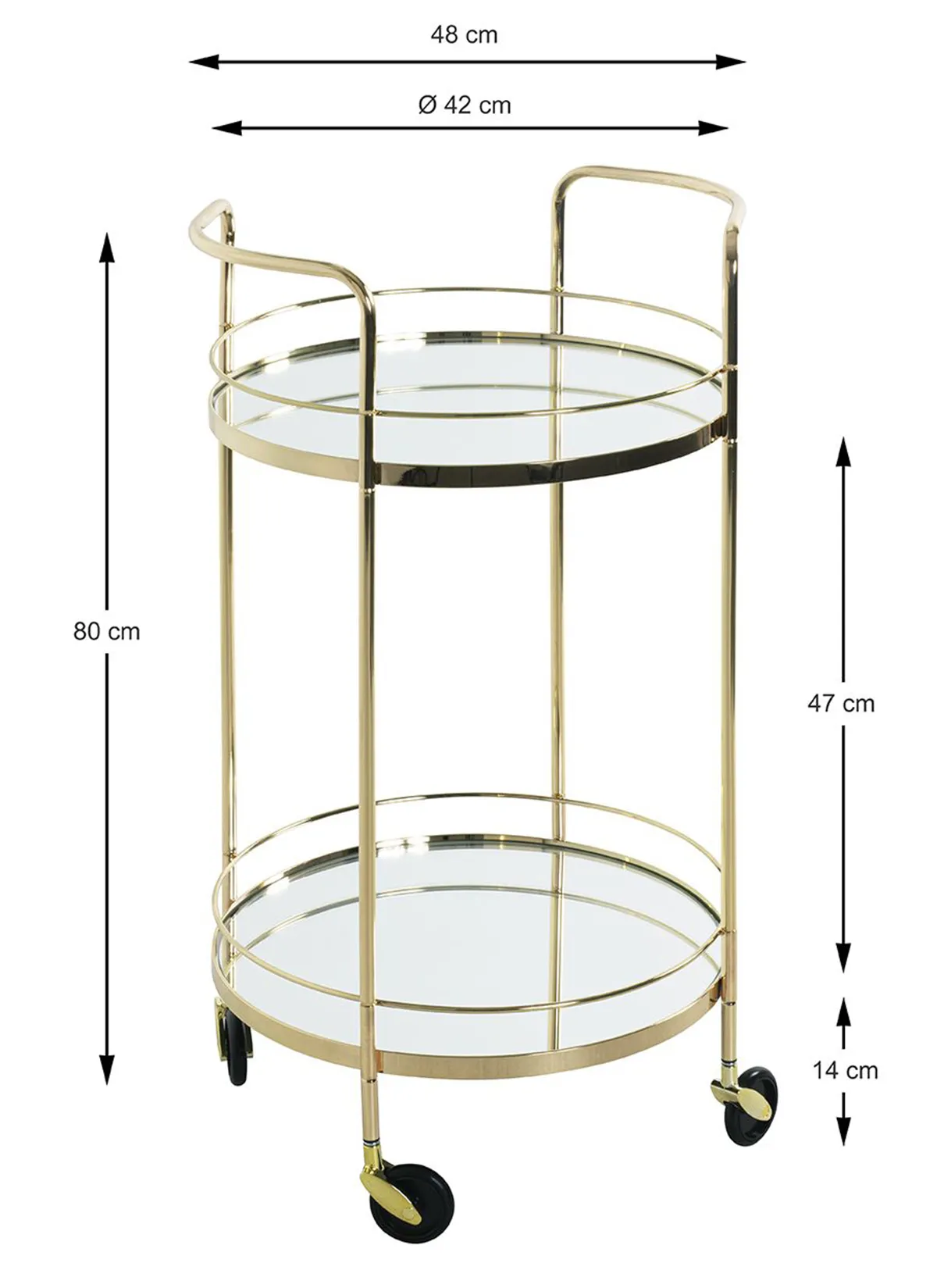 Les roulettes facilitent le déplacement entre les pièces, utile pour servir et organiser lors d'un goûter, d'un brunch ou d'un apéritif. La finition or brillant valorise les objets posés et crée une présence décorative dans un intérieur contemporain ou classique. Le poids de 7 kg contribue à une manipulation aisée, tandis que la conception tout métal et miroir privilégie la durabilité et un nettoyage rapide au quotidien.