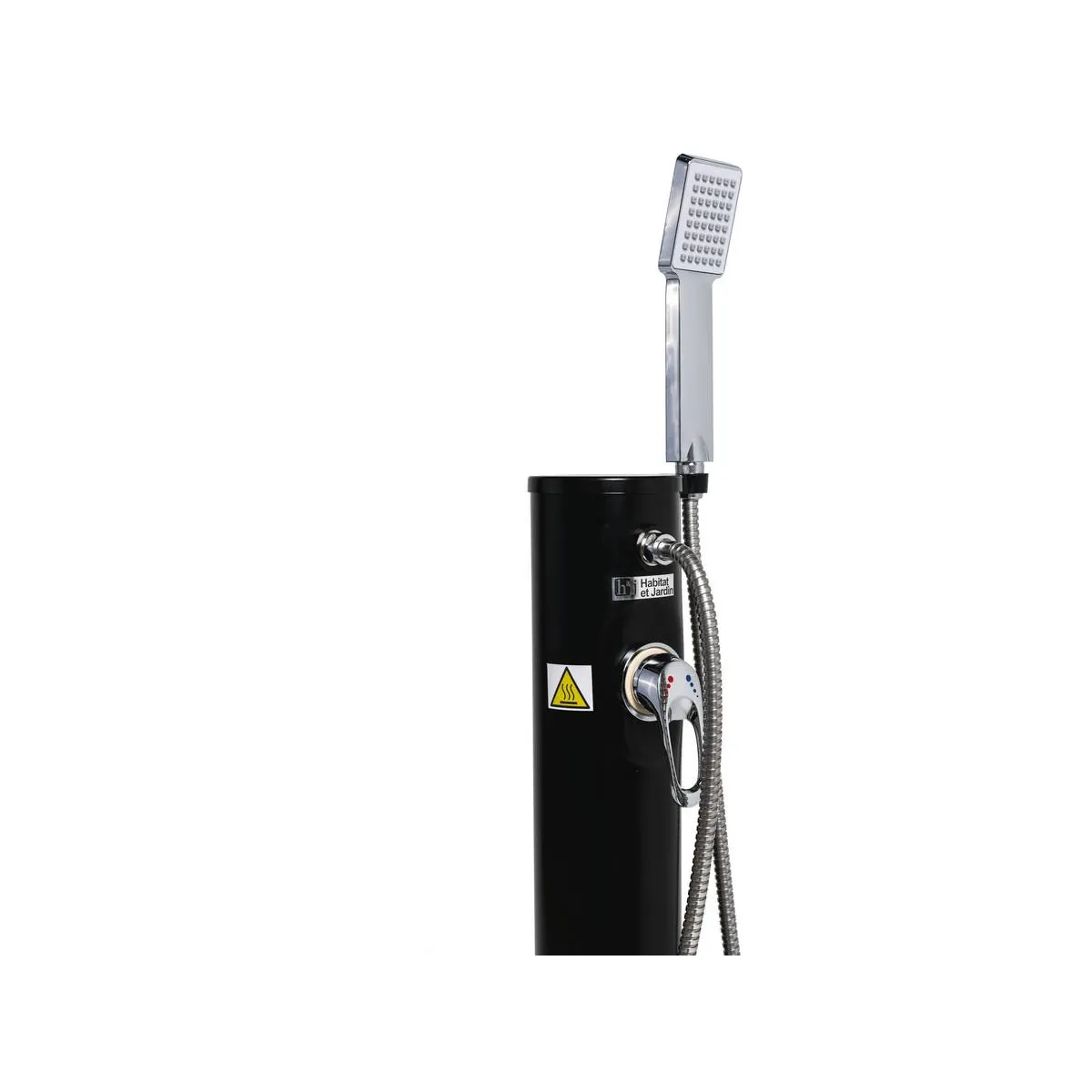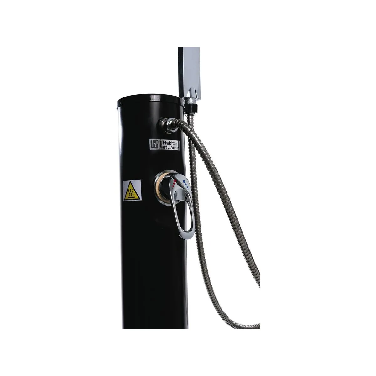 ConfortPrincipalement conçue en PVC, cette douche solaire est équipée d'un réservoir d'eau de 10L. Une telle capacité vous laisse tout le loisir de vous rincer comme vous l'entendez et de vous détendre.Elle est également pourvue d'un pommeau de douche à poignée que vous pourrez suspendre à un support sur la colonne. Ce pommeau amovible vous accordre un confort ainsi qu'une expérience d'utilisation très appréciée.Energie solairePour une utilisation agréable et saine, la douche solaire est équipée d'un réservoir d'eau qui se réchauffe non pas à l'électricité mais à l'énergie solaire.Écologique, l'eau se réchauffe grâce à la chaleur dégagée par le soleil. Cette exposition vous offre ainsi une eau chaude et agréable. FonctionnelleCette douche solaire est également dotée d'un mitigeur eau chaude/eau froide avec lequel vous pourrez ajuster la température de l'eau comme vous le souhaitez. InstallationLa douche solaire trouve naturellement sa place dans votre jardin.Solidement fixée à un sol de préférence en béton, son montage, simple et rapide, vous permet de profiter rapidement des bienfaits de la douche. Douche solaire de jardin pour piscine - 10 litres - Dimensions douche uniquement : 15 x 110 cm - Dimensions avec pommeau de douche : 15 x 134 cm - Structure : PVC - Pommeau de douche à poignée - Avec mitigeur eau chaude / eau froide - Nécessite environ 3 heures d'exposition continue au soleil - Noir .Descriptif: Douche solaire de jardin pour piscine