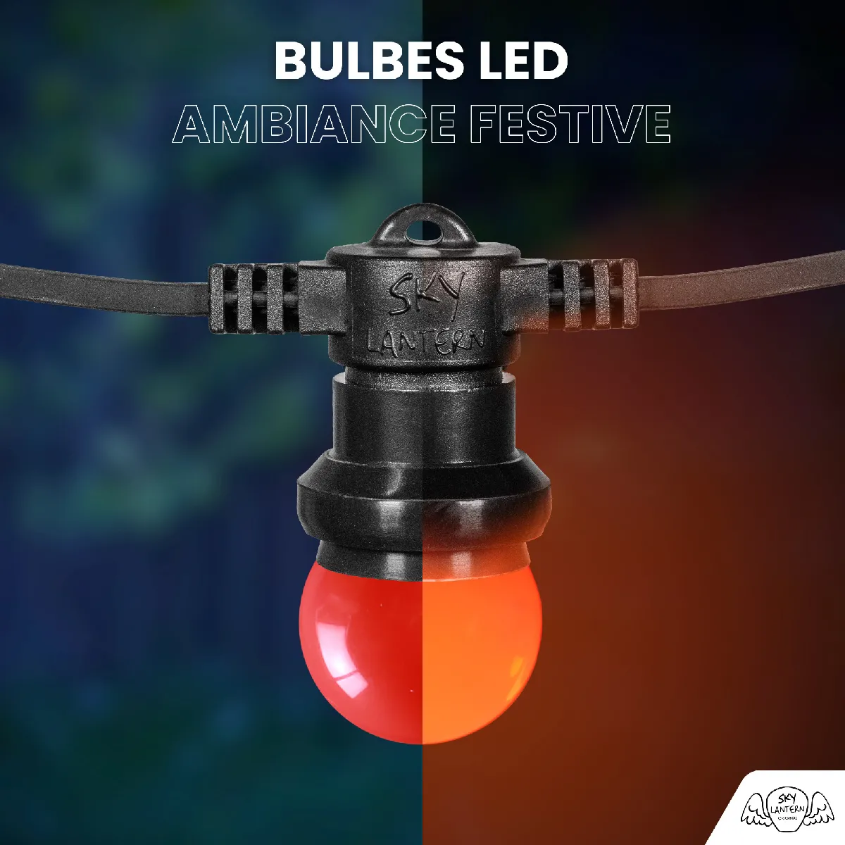 SkyLantern, leader en France de la guirlande LED guinguette de grande taille vous propose une guirlande guinguette de 40 mètres de longueur sans transformateur (prise 220V) pour illuminer vos grands espaces extérieurs: terrasses de châteaux, place du village, parc. Cette guirlande de grande longueur est totalement adaptée à un usage extérieur à l'année grâce à sa spécification IP65 (résistance maximum à l'eau et à la poussière).