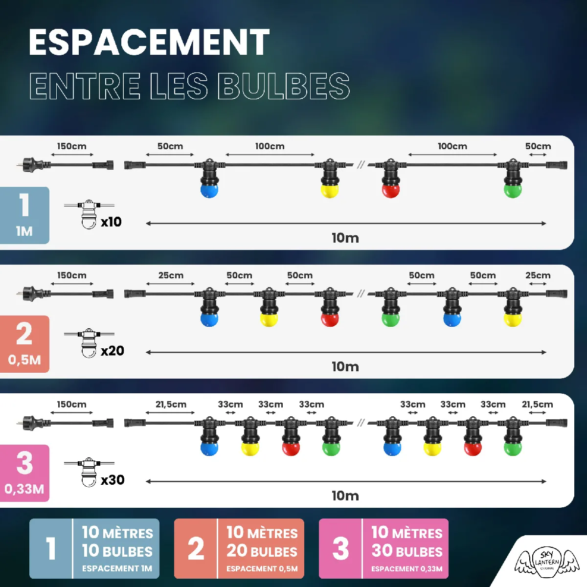 Ce kit comprend 5 guirlandes guinguettes de 10 mètres chacune raccordables entre elles et 50 bulbes LEDs multicolores dotés de 8 LEDs chacune. L'utilisation d'un module de 8 leds par bulbe permet un éclairage intense sur chaque bulbe. Ce kit guirlande guinguette contient 13 bulbes bleus, 13 jaunes, 12 rouges et 12 verts. Ces bulbes sont remplaçables (culot E27). Toutes nos Guirlandes Guinguette sont garanties 2 ans.