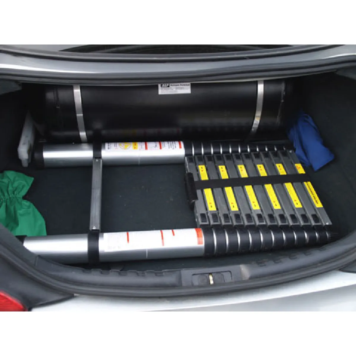 Cette nouvelle échelle téléscopique est facile à transporter, elle entre même dans le coffre d'un coupé équipé de l'installation au gaz et peut atteindre une longueur de 4.10m.