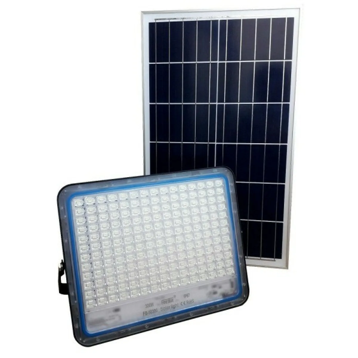 Projecteur LED 300W avec panneau solaire à lumière froide + télécommande FB-58300Projecteur LED avec panneau solaire 300W.Caractéristiques Eclairage : LED Puissance : 300 W Type de LED : SMD Température de la lumière : 6500K Aucune connexion électrique n'est nécessaire Télécommande IR Fixation du spot et du panneau à l'aide d'un support Degré de protection : IP67 Dimensions du spot : 345 x 280 x 65 mm environ Dimensions du panneau : 580 x 350 x 20mm env.Contenu de l'emballage 1 Spot avec support 1 Panneau solaire avec support 1 télécommande
