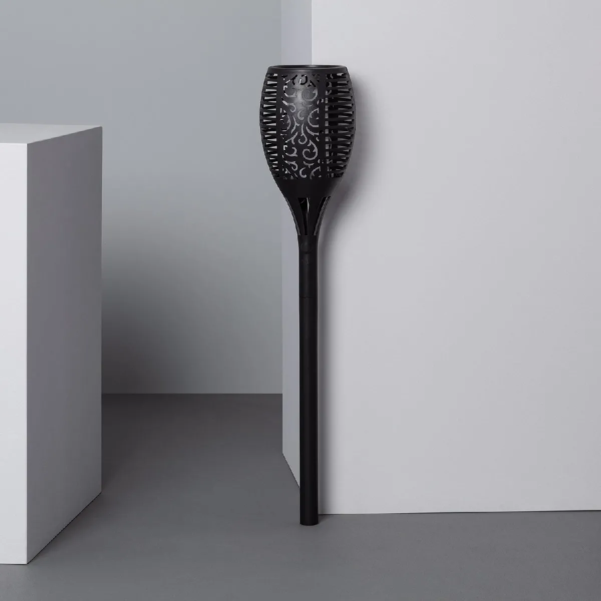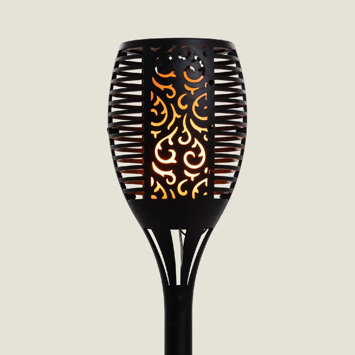 Cette torche LED est dotée d’un système de LED innovants qui créent un effet de flamme lorsqu'ils sont allumés. Elle dispose de 2 modes : "normal" et "flamme" qui simule le mouvement d'une flamme avec du vent. Équipée d'une plaque solaire qui permet de recharger sa batterie de 2200 mAh et 20 heures d'autonomie. Son indice de protection IP44 assure une protection contre les éclaboussures d'eau mais n'assure pas une protection contre la pluie.
