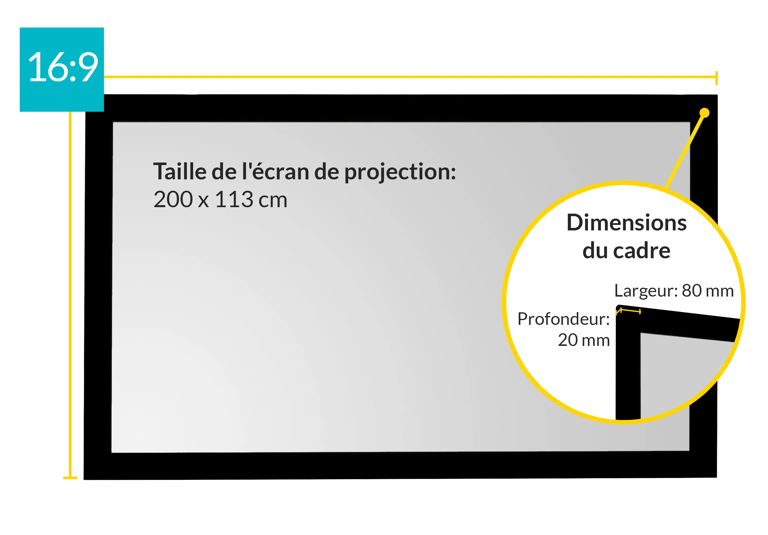 La surface visible de 200 x 113 cm en format 16:9 offre une base stable pour des images nettes dans un salon ou une salle dédiée. La toile PVC blanche mate, avec gain 1,2 et angle de vision de 140°, favorise une restitution homogène pour plusieurs spectateurs. Le cadre en aluminium recouvert de velours noir pour limiter les reflets périphériques améliore la perception du contraste. À l'arrière, les ressorts assurent un tendu régulier sur toute la surface, utile pour préserver la précision des contours et éviter les ondulations. Les équerres de montage ajustables facilitent la pose sur un mur droit.