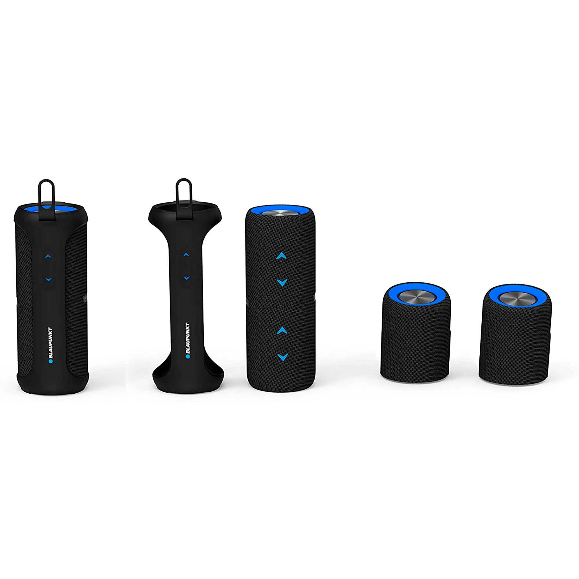 Son boîtier étanche répond à l'indice IPX7 pour une utilisation sereine près de l'eau et sous la pluie. La batterie lithium-ion intégrée de 3000 mAh offre plus de 5 heures d'autonomie, pratique pour une après-midi d'écoute, avec une charge complète en 3 à 4 heures via le câble USB inclus. Le format compact 84 x 84 x 210 mm et l'étui en silicone permettent de transporter facilement les deux modules d'enceintes ensemble, tout en protégeant la surface extérieure lors des déplacements.