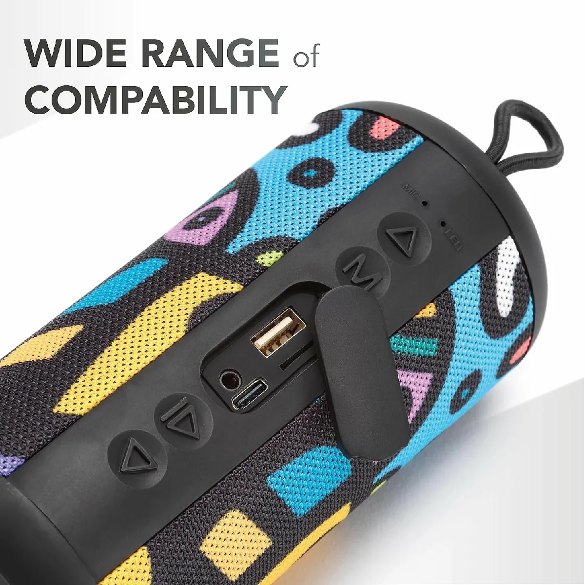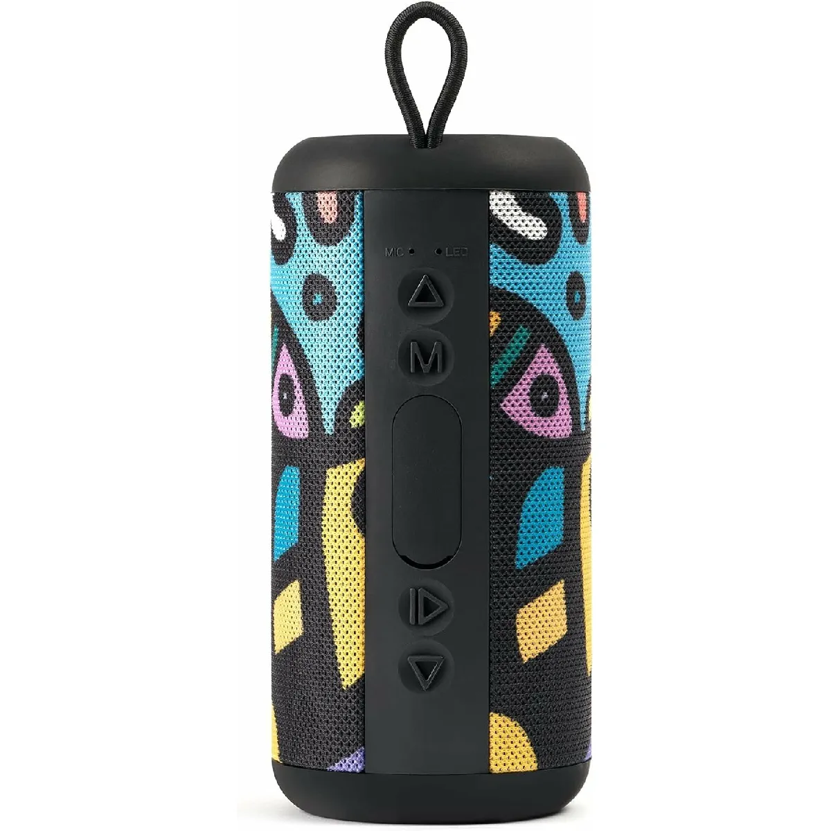 Le design cylindrique multicolore s'adresse aux écoutes conviviales, avec une prise en main facile et des dimensions adaptées au transport. La présence d'une sangle élastique pour l'attache sur un sac à dos facilite les déplacements. La diffusion audio 5 W couvre les activités courantes, tandis que le jumelage Bluetooth 5.0 assure une connexion stable avec smartphones, tablettes et ordinateurs. Pour varier les sources, l'enceinte lit directement les fichiers depuis une carte MicroSD ou une clé USB, et accepte une liaison filaire via câble auxiliaire.