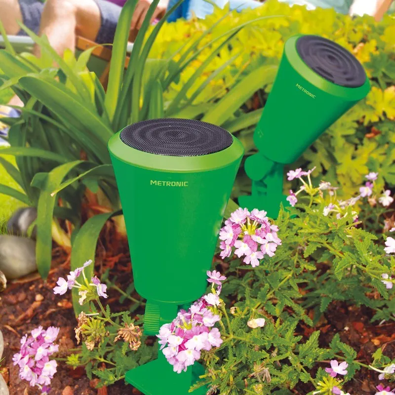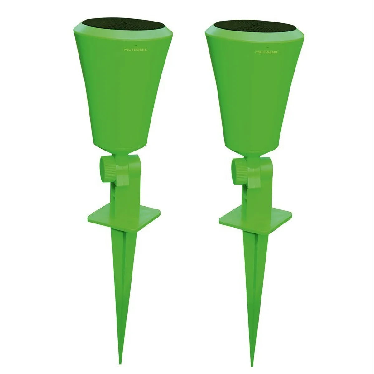 Pensée pour l'extérieur, la Metronic Garden Speaker se fixe sur des piquets fournis afin d'orienter précisément le faisceau sonore et incliner jusqu'à 90°. Cette souplesse de placement aide à optimiser la couverture dans différents aménagements, du coin repas à l'allée. Le format sans-fil limite l'encombrement et simplifie le transport entre zones de vie. Avec sa couleur verte qui se fond dans l'environnement, l'installation reste discrète pour sonoriser vos espaces sans attirer l'attention.
