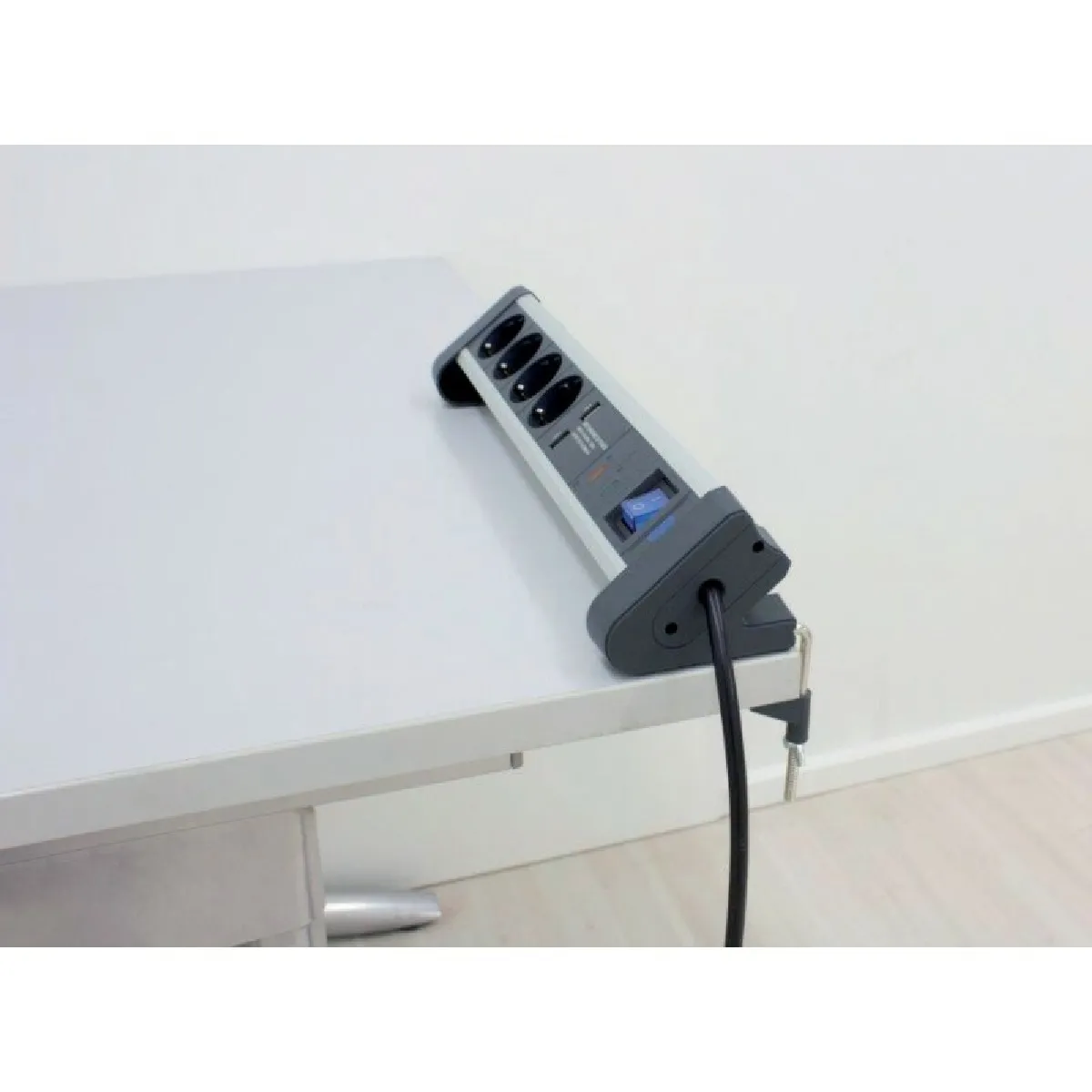 Son format allongé permet un montage discret sous ou sur un bureau, grâce à des dimensions adaptées (env. 660 × 140 × 50 mm) pour un accès ordonné aux prises. La construction soignée et le passage de câble sous gaine plastique simplifient le routage et réduisent l'encombrement. Le raccordement standard 230 V facilite l'intégration dans l'existant, tandis que les 10 sorties permettent de réduire les adaptateurs multiples et de centraliser l'alimentation des postes de travail.