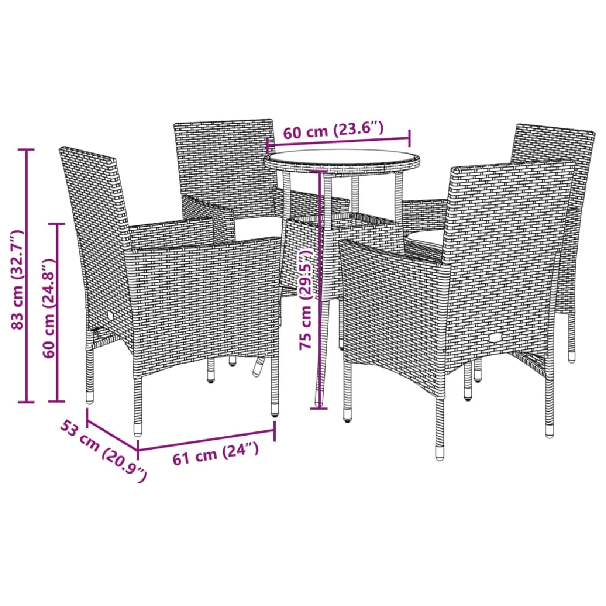 - Matériau : résine tressée, acier enduit de poudre, verre trempé