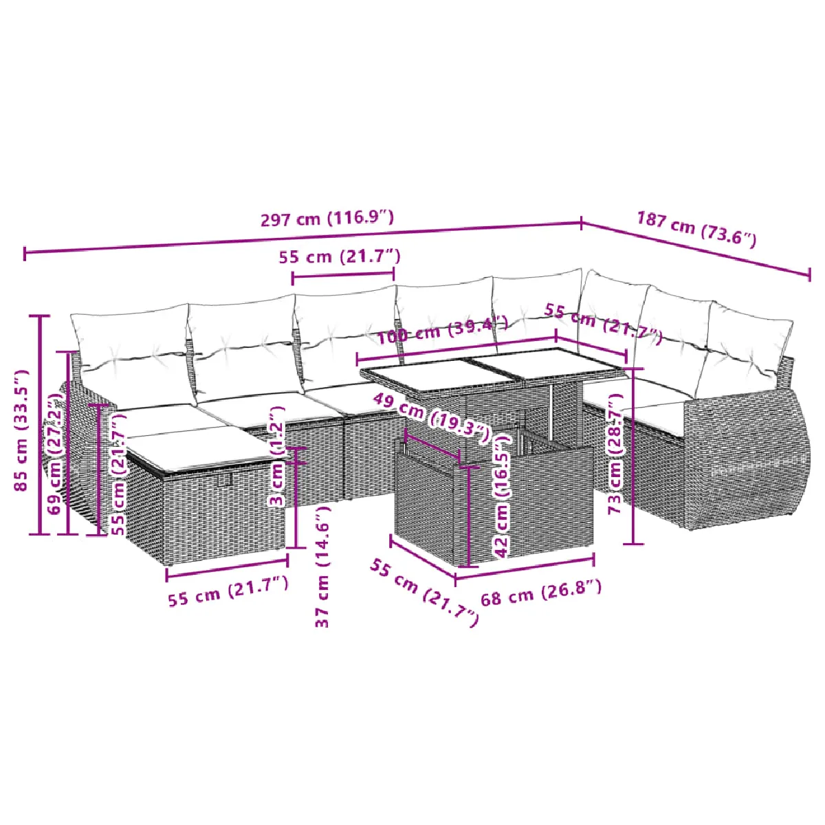 - Conception modulaire : cet ensemble de meubles d'extérieur a une conception modulaire, ce qui le rend complètement flexible et facile à déplacer, afin que vous puissiez créer un agencement de meubles d'extérieur personnalisé.