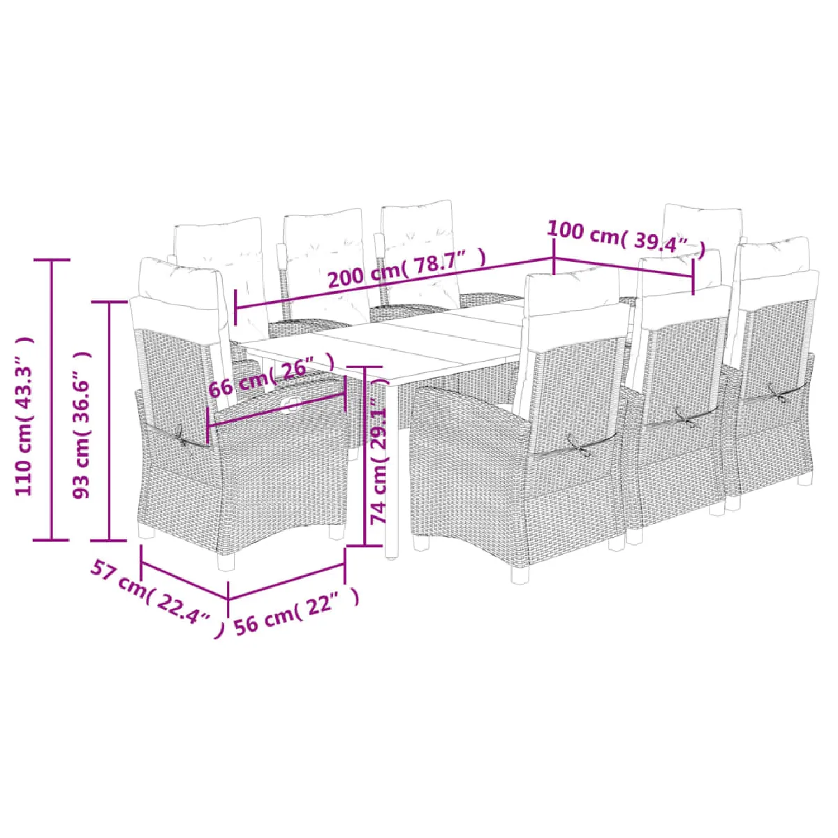 - Dimensions : 200 x 100 x 74 cm (L x l x H)
