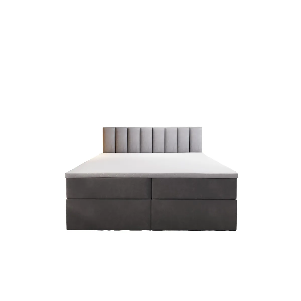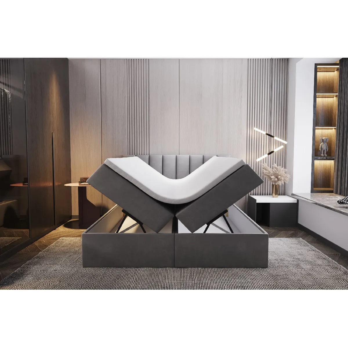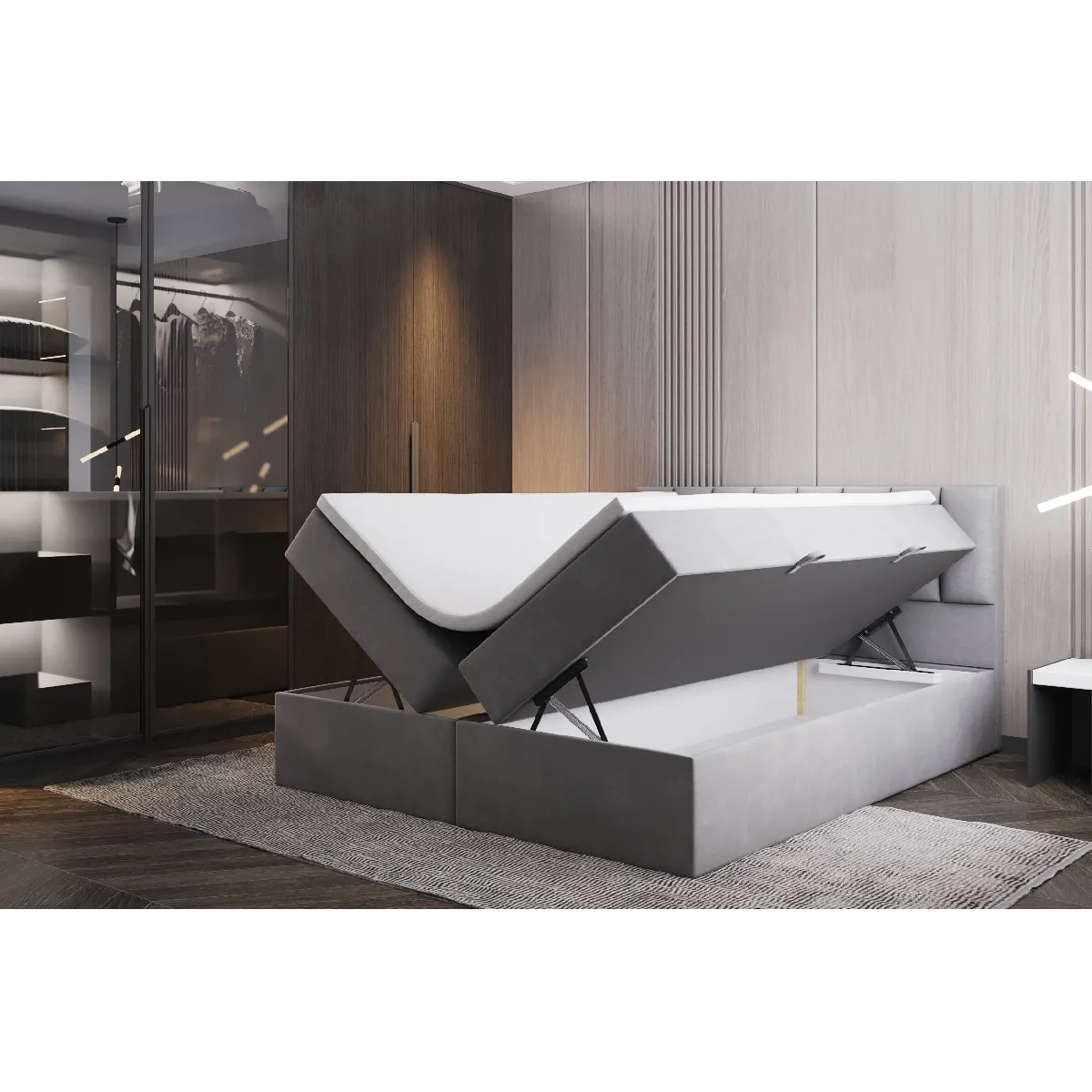Caractéristiques principales : 2 grands coffres de rangement pour la literie. 2 matelas ressorts bonnell intégrés dans le cadre en bois. Un surmatelas pour encore plus de confort. Vérins à ressort pour faciliter le levage. Tête de lit rembourrée avec des surpiqûres décoratives. Cadre solide en bois massif. Tissu velours anti-tâches : Casablanca.