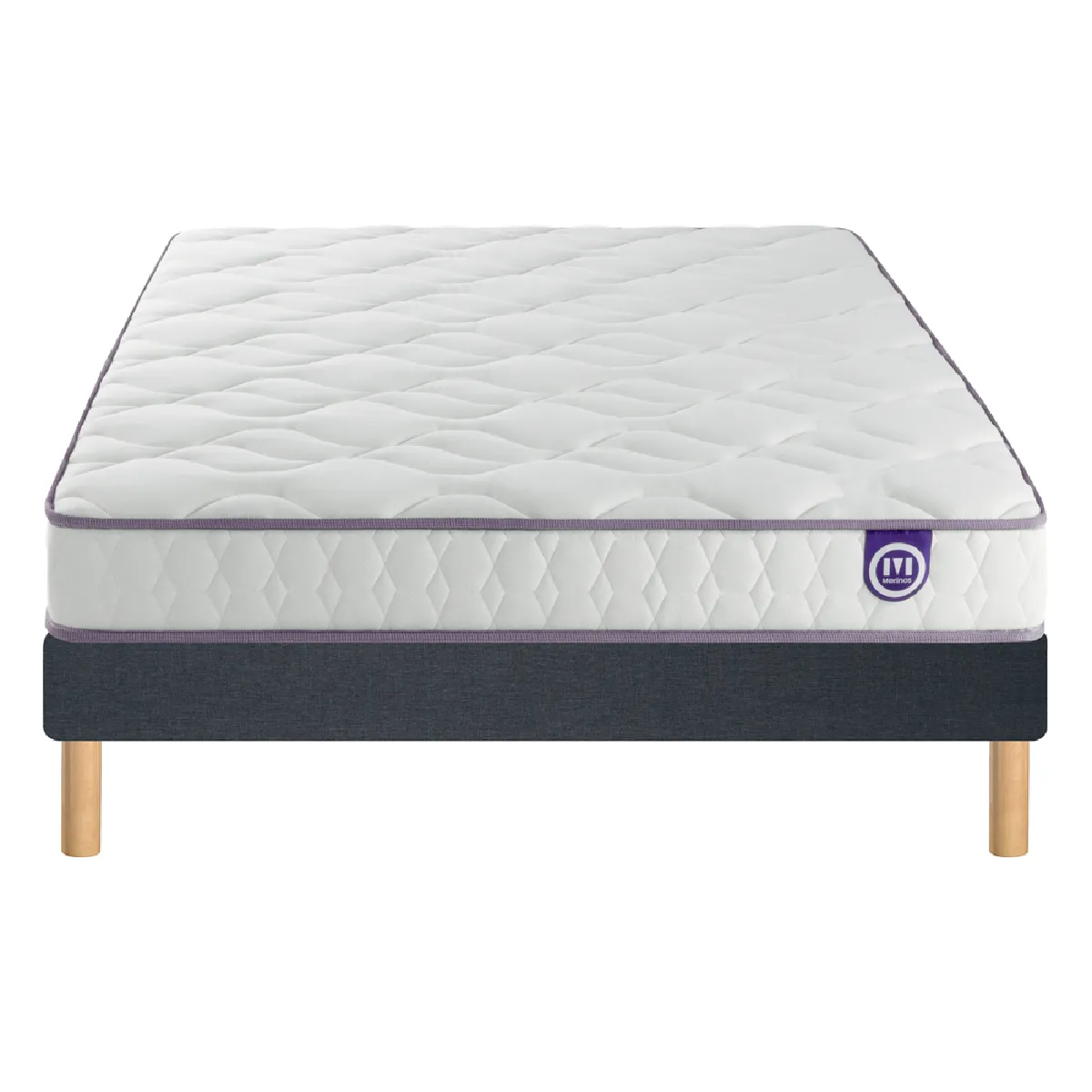 Sommier tapissier Merinos STYLO Confort Ferme : 15,5 cm - 2x12 lattes massives - Confort Ferme - Pieds Wengé inclus - Plateau piqué 3D pour une aération optimale - Bande piquée - Toile de fond
